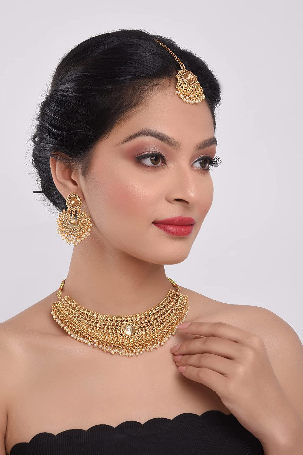 Content: 1) Inner Circumference/ Length: 8" Inch (20.3 cm), Necklace L x W: 16" Inch x 2" Inch (40.6 cm x 5 cm), with an adjustable soft tassel closure and it fits to neckline size 4.5" Inch (11.4 cm), 2) A pair of Dangle Earrings L x W: 2.2" Inch x 1.4" Inch (5.6 cm x 3.6 cm), 3) Maang tikka L x W: 5.6" Inch x 1.1" Inch (14.2 cm x 2.8 cm)