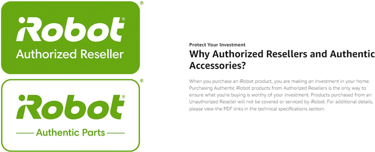 • iRobot does not certify the quality or authenticity of products purchased from non-authorized resellers, and will not cover claims, provide service or offer replacements for products purchased from these sellers.