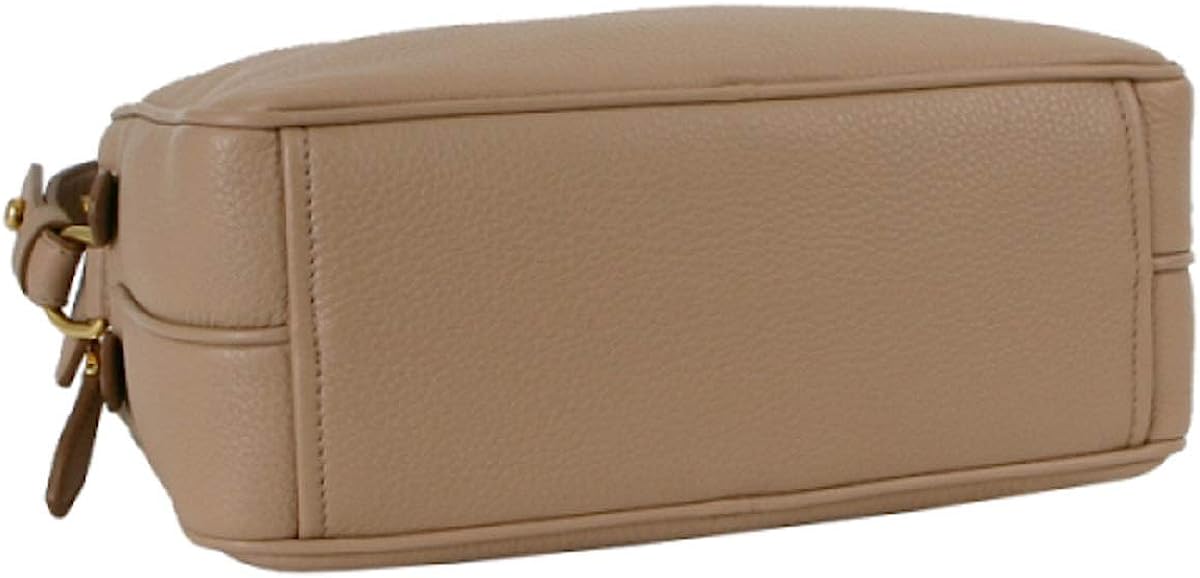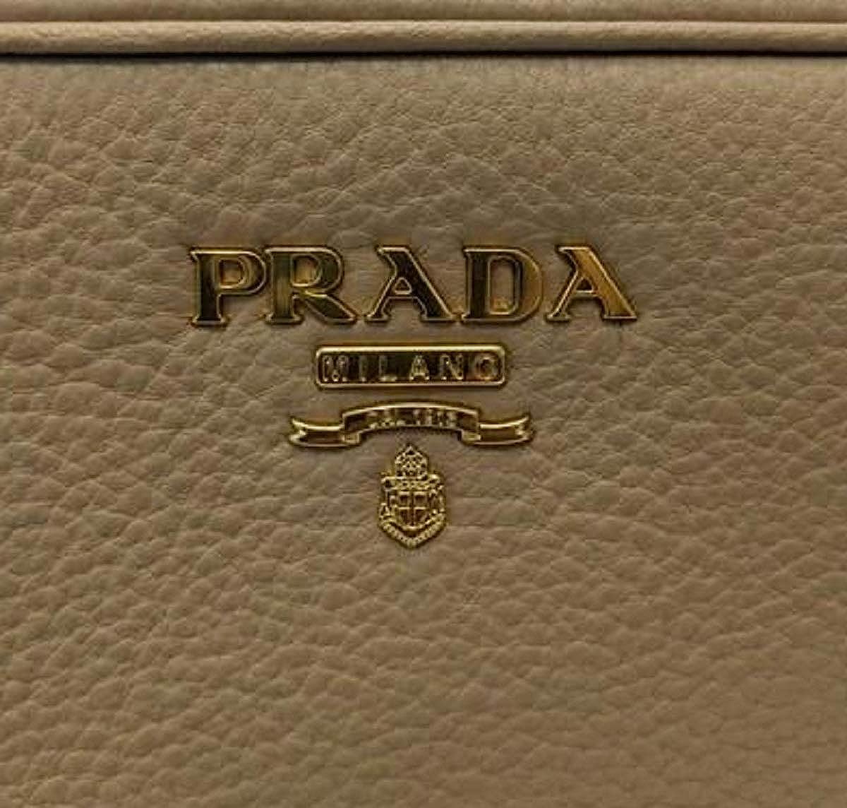 The bag features a gold Prada Milano logo on the front and an adjustable leather strap. The two zipper compartments open to a spacious jacquard lined interior that allows for convenient storage and organization. This Prada handbag is great for everyday use with the distinctive quality and style of Prada! Model Number: 1BH079. Cammeo Beige. Vitello Phenix Grain Leather. Gold-tone Hardware. Prada Milano Logo. Zipper Fastening. Two Zipper Compartments.