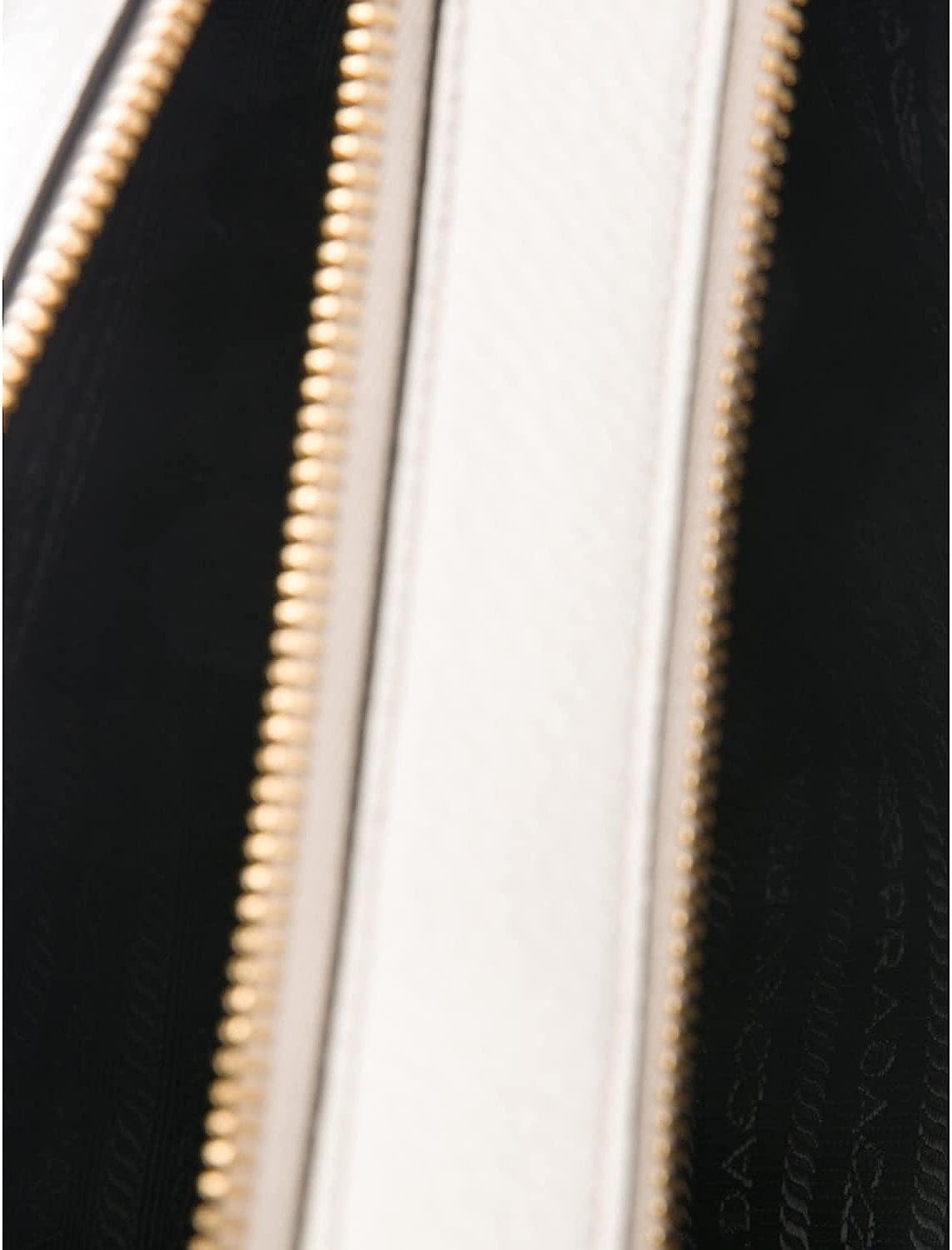 • The two zipper compartments are great for storage and organizing your personal belongings. The gold toned hardware and Prada Milano logo goes beautifully with this white Prada handbag. Model: 1BH079 Material: Vitello phenix leather Color: Bianco white