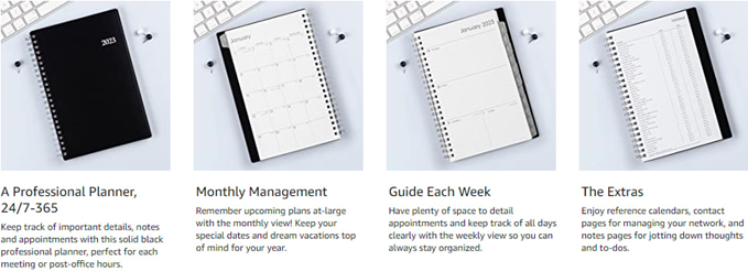 • January 2023 - December 2023 stylish day planner with 12 months of monthly and weekly pages for easy year-round planning; 6 additional monthly pages (July 2022 - December 2022) are included