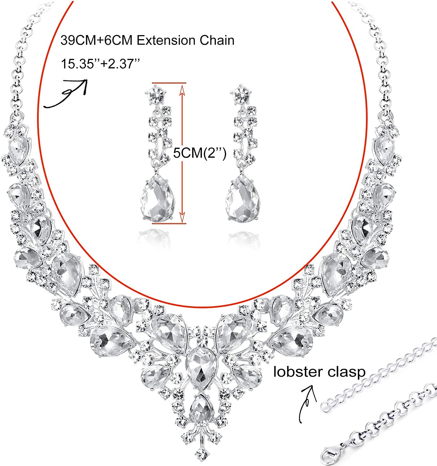 RHINESTONE JEWELRY SIZE-- Crystal Necklace Adjustable Chain Length 39cm (15.35’’)- 45cm (17.72’’), Bridal Drop Earrings Length: 5cm(2’’). Teardrop Bracelet Length: 19.5cm(7.7’’), With 7cm (2.8’’) Extension Chain, Easy To Adjust, No Worry About Size Problem.