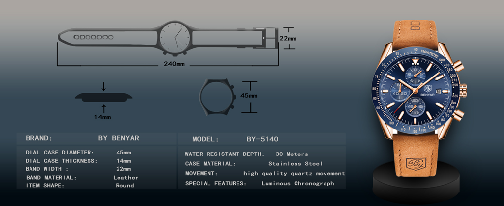 BENYAR Classic Fashion Elegant Chronograph Watch Casual Sport Leather Band Mens Watches 5140L