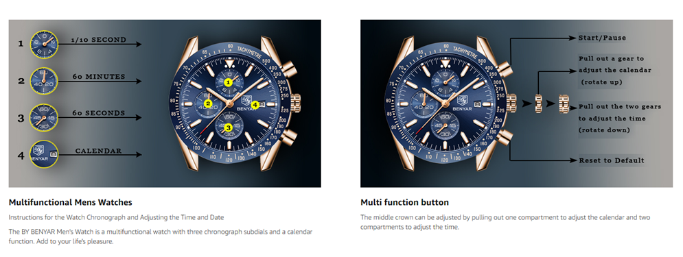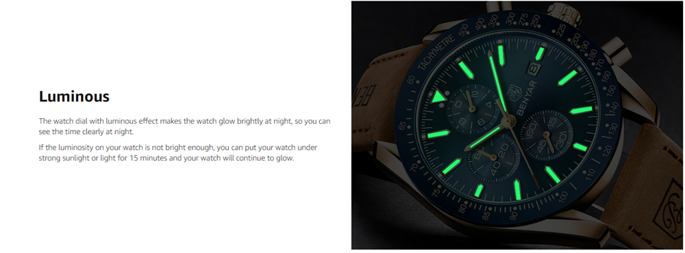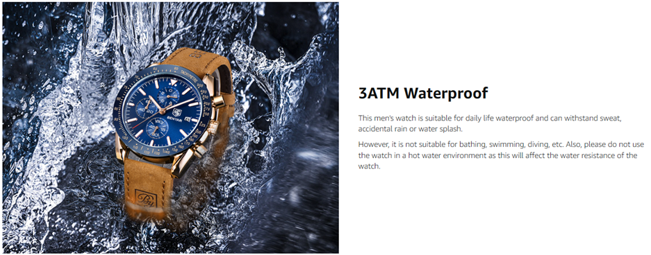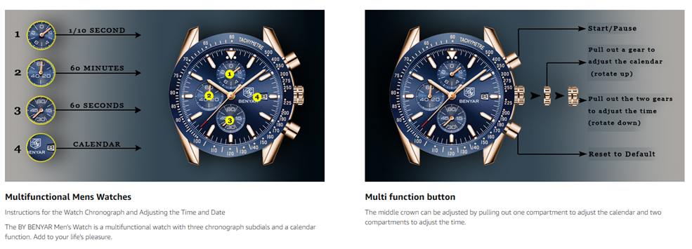 • DAILY USE: 30M waterproof and date display, Three Chronograph Sub-dial, 1/10 seconds sub-dial, Seconds Sub-dial and Minute Sub-dial.Easy to operate, intuitive to watch.