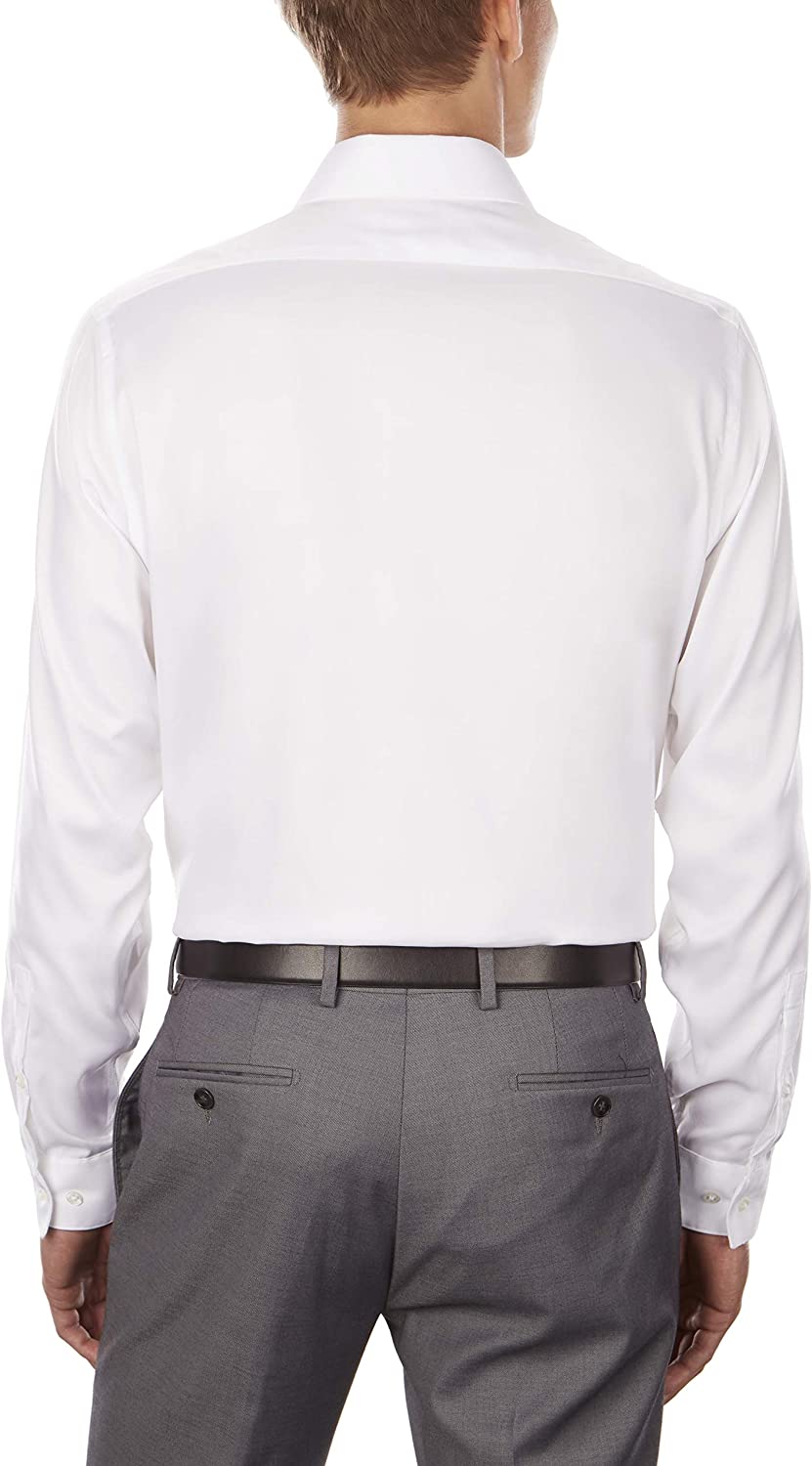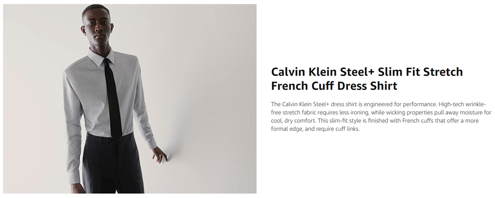 Calvin Klein non iron stretch long sleeve dress shirt with French cuff.Spread collar, French cuff, and no pocketAdvanced non iron stretch fabric balances temperatureWicks moisture for cool, dry comfortStretch fabric allows for a full range of movementSlim fit dress shirts have tapered sleeves, higher arm holes, and a slimmer cut at the chest and waist. This fit is similar to a fitted or athletic fit.