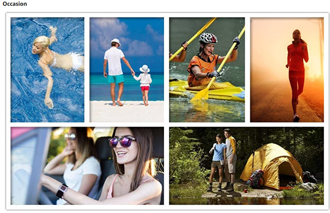 • 4. OCCASION - beach, swimming, pool, wake-boarding, sailing, boating, kayaking, windsurfing, cycling, jogging, walking, fishing, beach volleyball, gardening, lawn, car-washing and driving. Family outings!