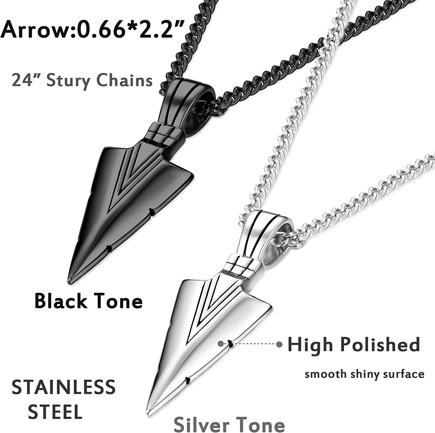 NECKLACE DIMENSION-- 2Pcs Necklace Are In Same Size, Arrowhead Pendant: 0.66*2.2"(17mm*56mm), Come With 2Pcs 24Inches Sturdy Curb Chains, Best Length As Necklace; Color: Silver Tone/Black Tone; Good Weight To Hang On Your Neck, Definitely Would Be Nice For Anyone!