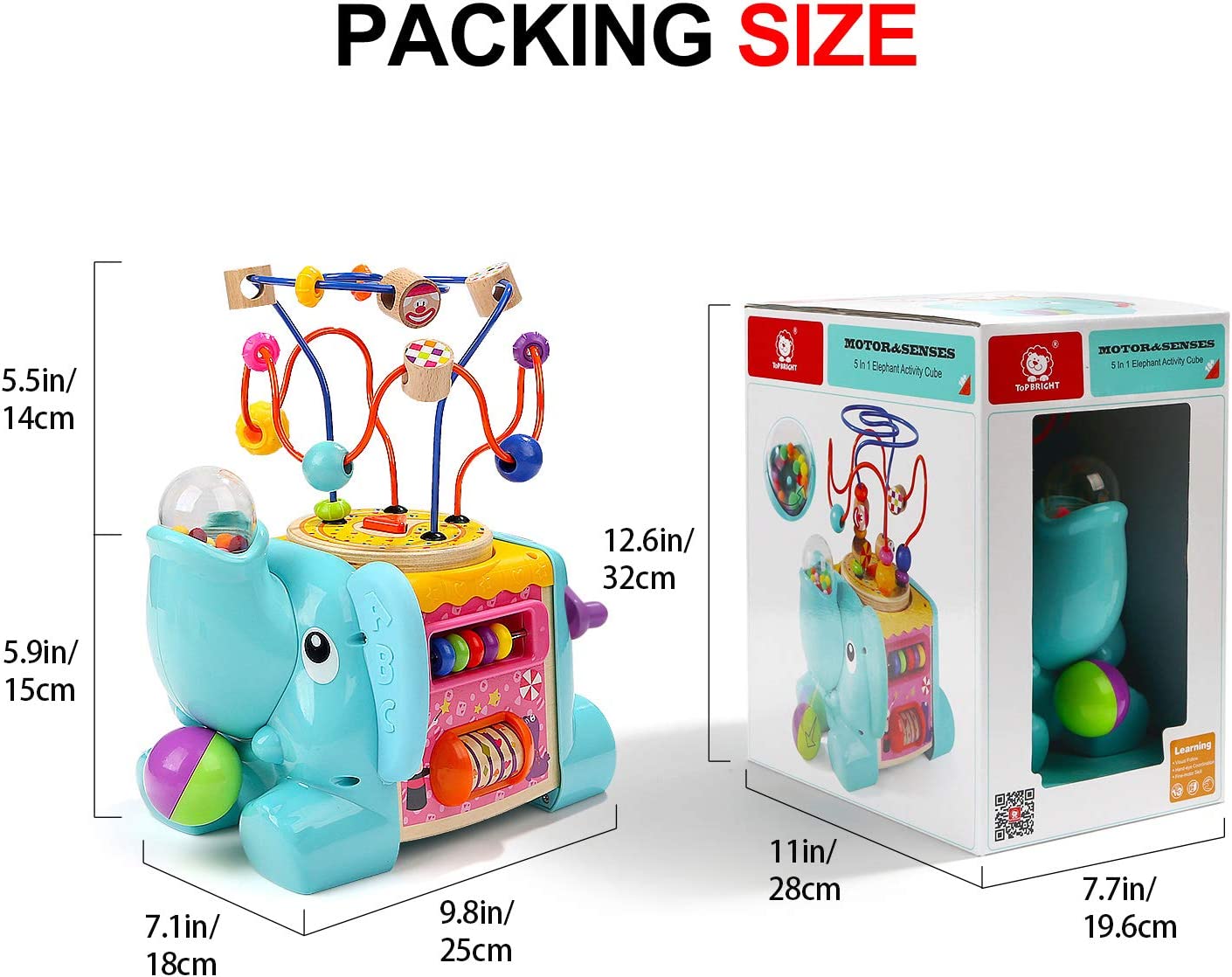 5 SIDES OF ACTIVITIES: Exploration and fun is around each corner of this activity cube toy for 1 2 year old boy and girl. This activity cube has five different sides of game-plays which make children more interested in, including rainbow spinning gear, turning wheel, color counting beads and even a rotatable and detachable bead maze. Pull the ball on the trunk of the elephant, and then the colored beads in the transparent ball will beat.