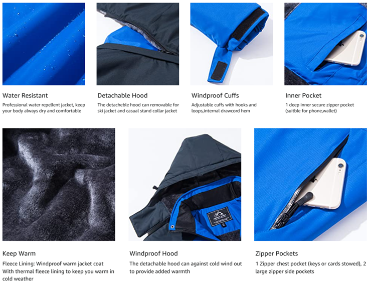 • Water repellent: Professional water repellent jacket, keep your body always dry and comfortable, you won't worry about getting wet while skiing, snowboarding, hunting, hiking in inclement weather