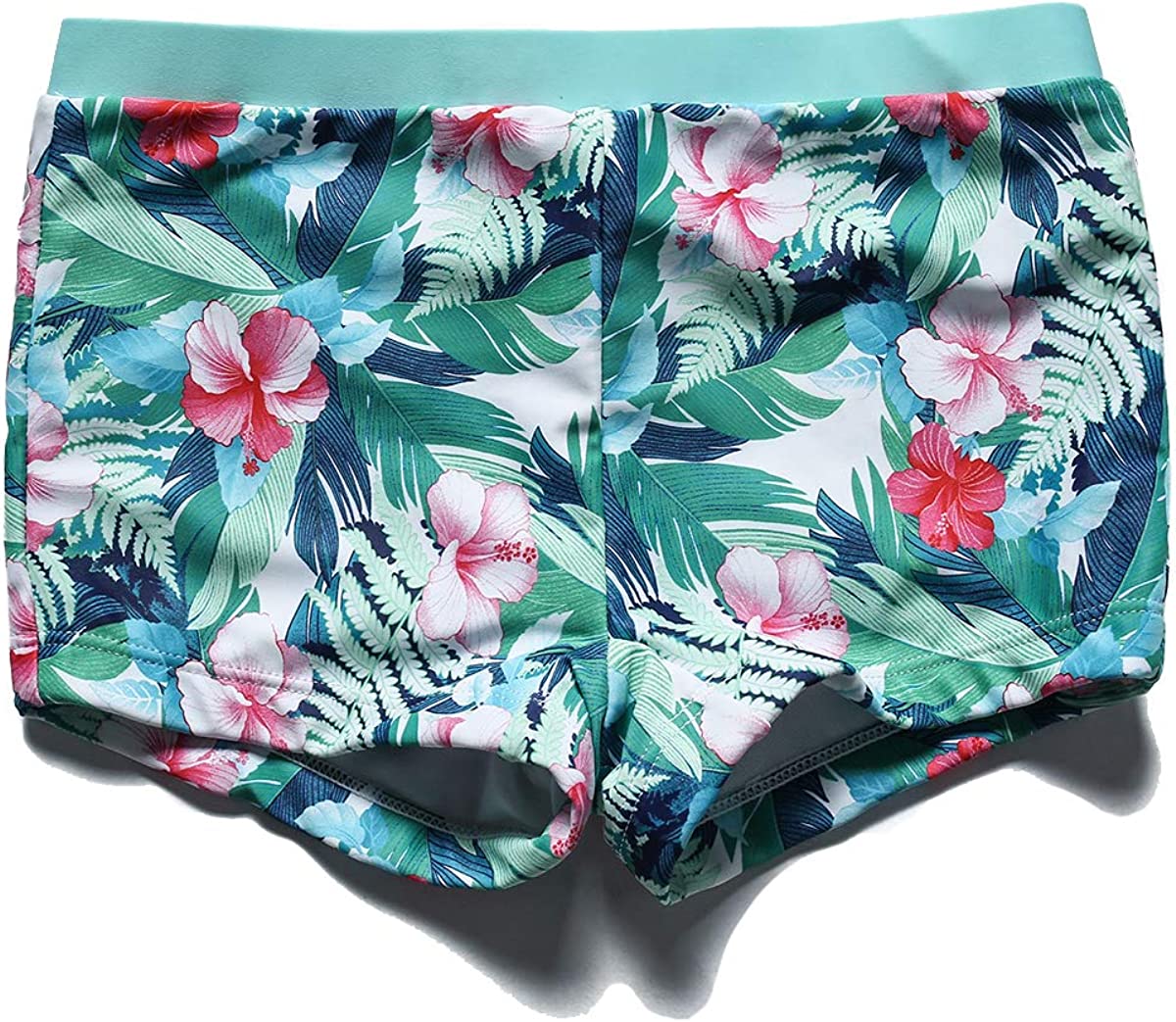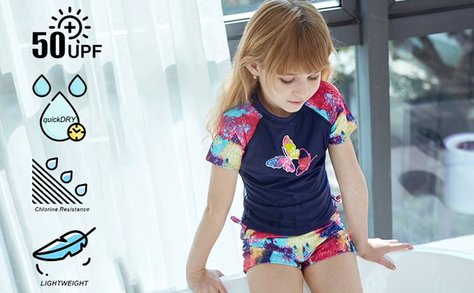 Swim set features short sleeve swim top and full-coverage boy cut shorts swim bottoms