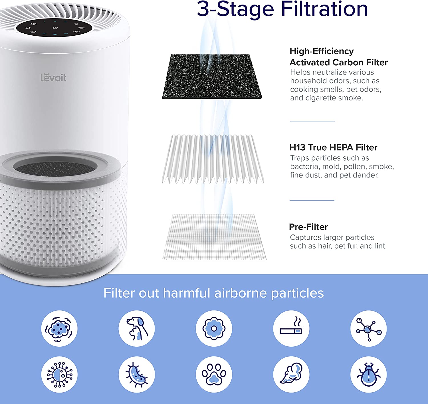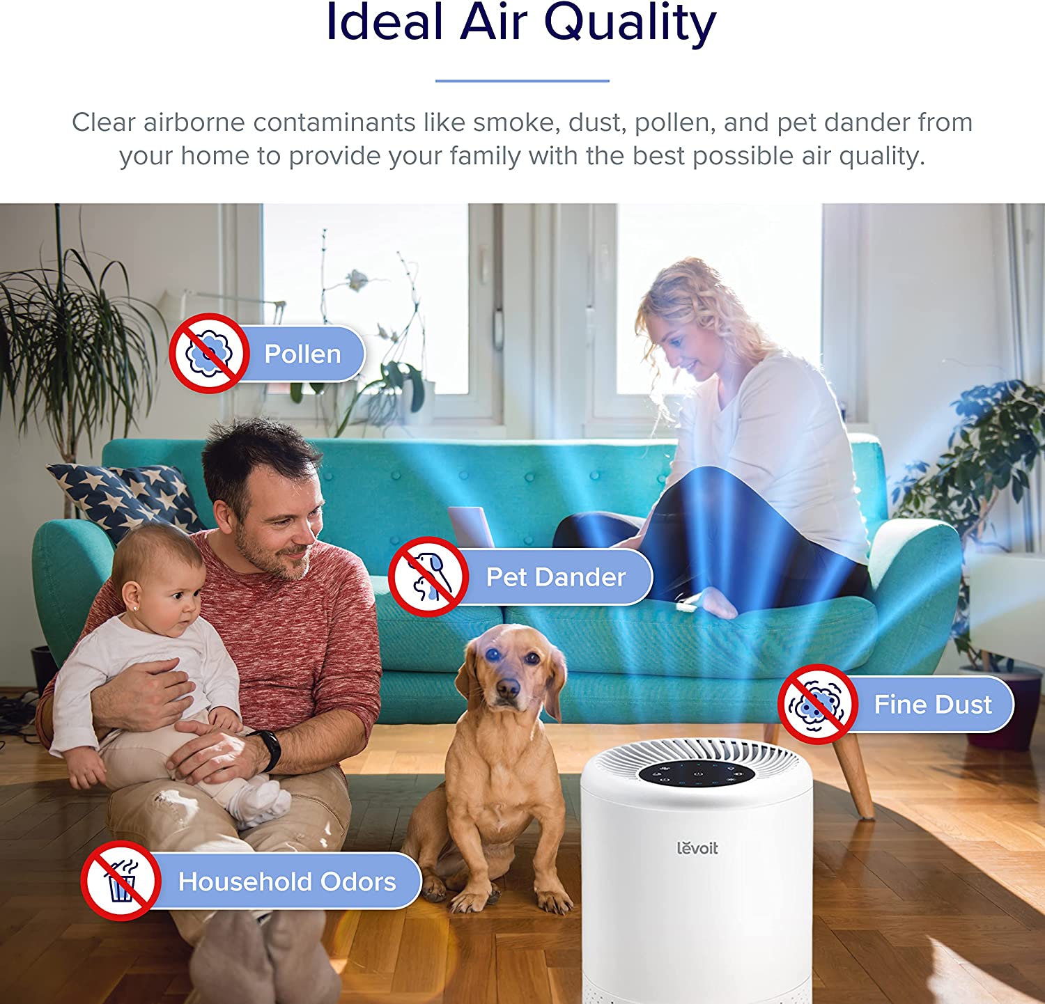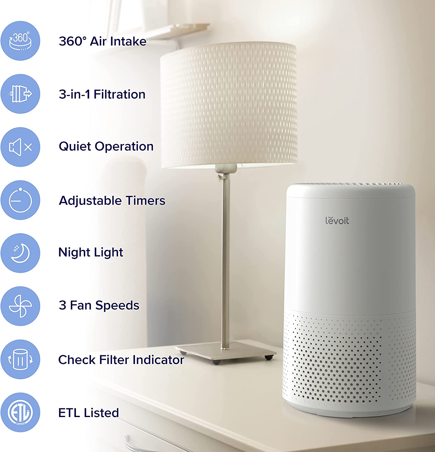 • OZONE-FREE FILTRATION: UV-C light purification methods can produce high levels of ozone that are harmful to children, asthma patients, and pets; This air purifier is ozone-free and ETL certified so you can experience clean, healthy air with Levoit
