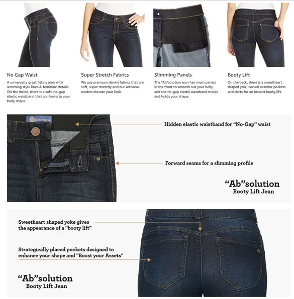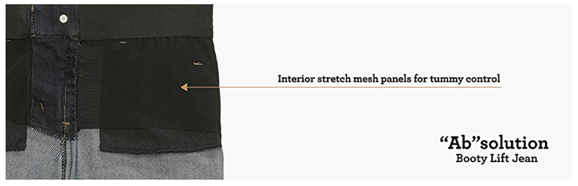 • Democracy’s signature “Ab”solution jean uses innovative construction that incorporates super-stretch denim, slimming panels, a hidden inner elastic waistband, mesh panels, signature curved back yoke, and strategically placed pockets