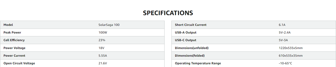 | Included Components | 1*Jackery SolarSaga 100 Solar Panel. |