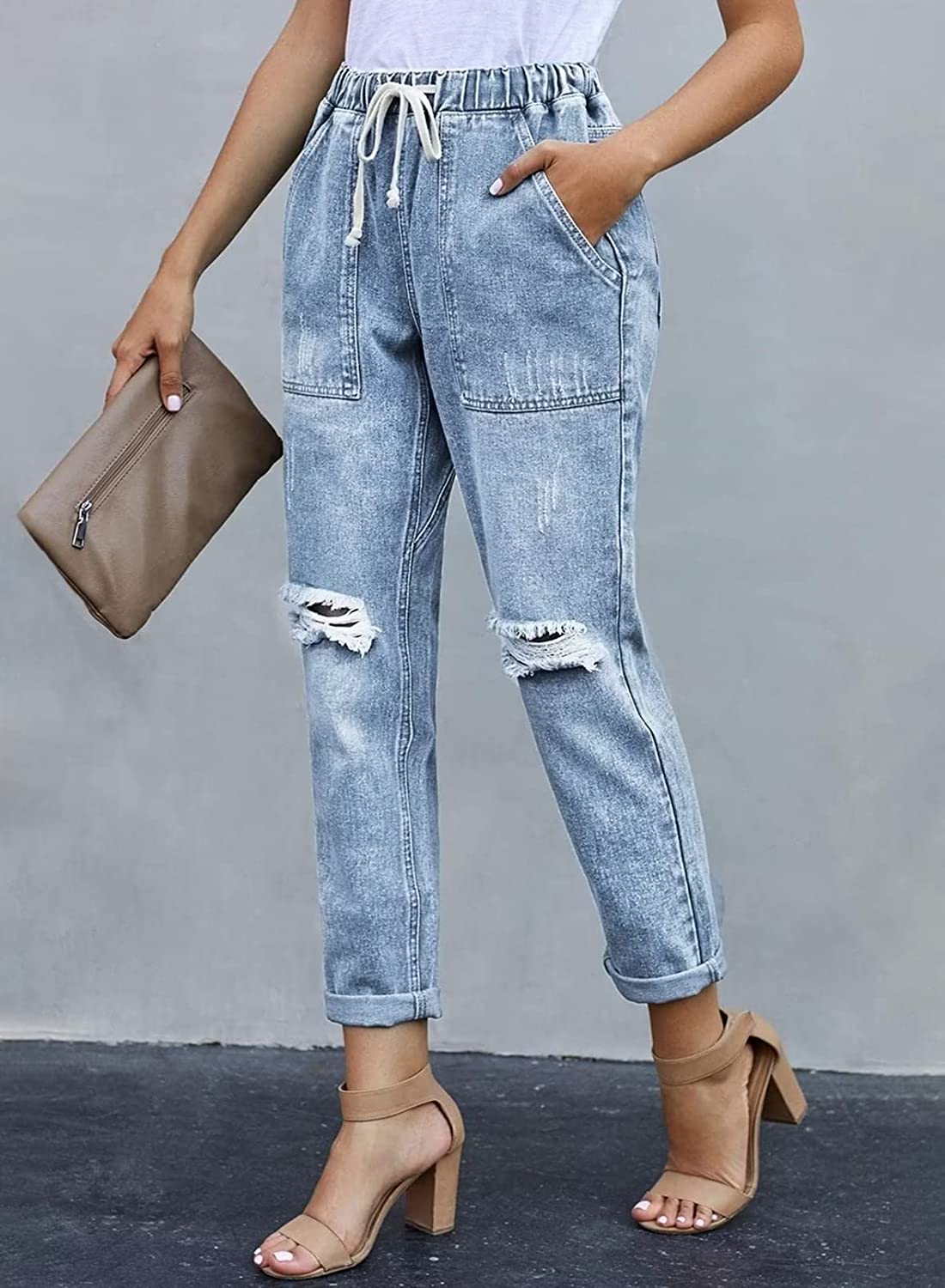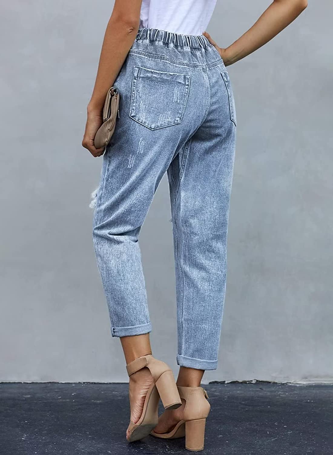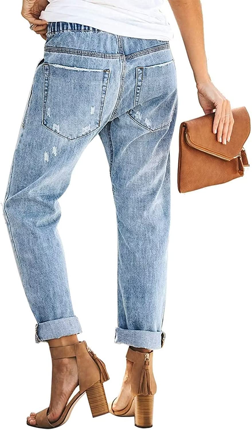 Sidefeel Women Pull-on Distressed Denim Joggers Elastic Waist Stretch Pants