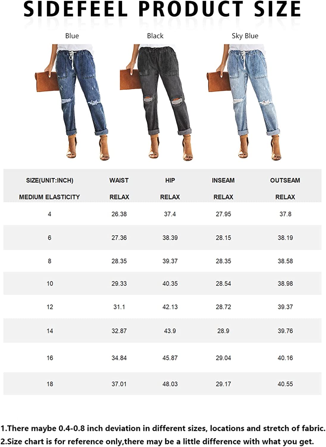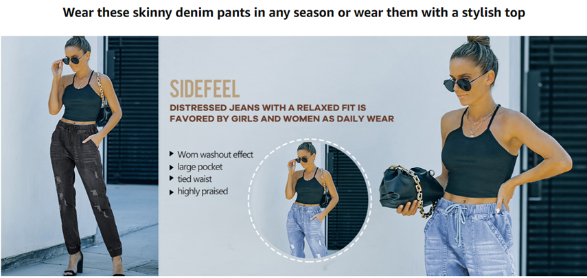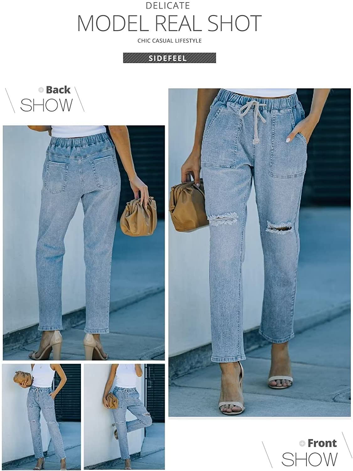 Sidefeel Women Pull-on Distressed Denim Joggers Elastic Waist Stretch Pants