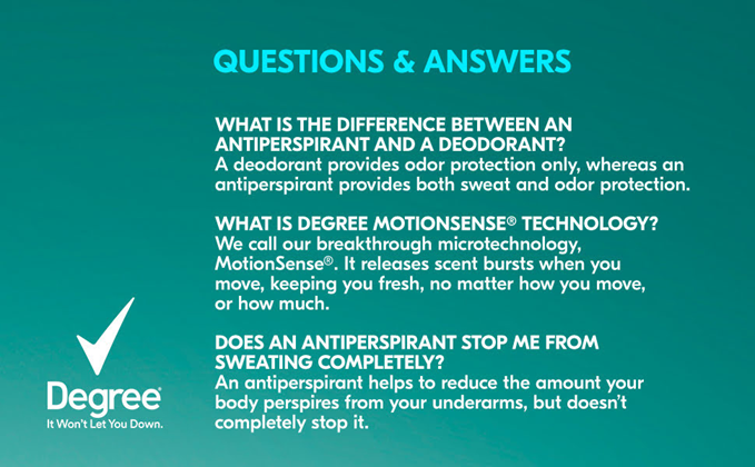 • GO BEYOND YOUR LIMITS: At Degree, we want to inspire the confidence in everyone to move more and go further. We’re here to support your journey through an antiperspirant for men that moves with you
