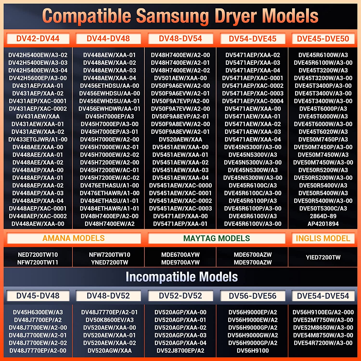 - Compatible Dryer Models: Azdele Samsung dryer heating element fits for dv42h5000ew/a3,dv45h7000ew/a2 dv48h7400ew/a2,dv42h5200ep/a3,dv40j3000ew/a2,dv42h5200ew/a3,dve50m7450w/a3,dv448aep/xaa,dv5451aew/xaa,dv42h5000es,dv331aer/xaa,dv5471aep/xaa,dv56h9000ep/a2,dv448aew/xaa,dv331aew/xaa,dv419aew/xaa,dv50f9a6evw/a2,dv50f9a7evp/a2,dv361ewbewr/a3,dv393etpawr/a1,dv407aew/xaa,dv45h7000ep/a3, etc. It's also suitable for brands like LG, Maytag, Sears, Kenmore, Kitchen-Aid and Roper.