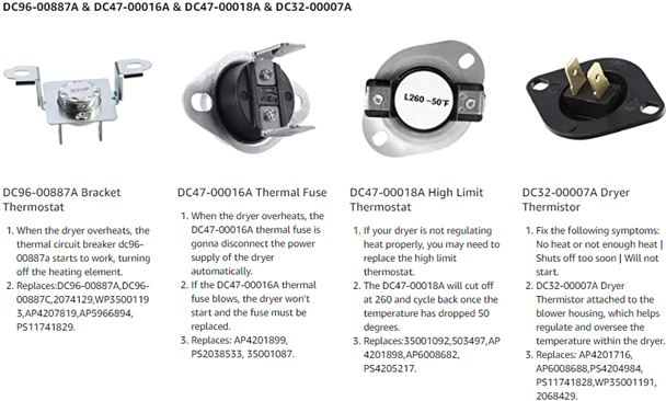- Dryer Solution Kit: Azdele samsung dryer parts fix all the heating problems. Thermal fuse DC96-00887A & DC47-00016A repair dryer won't start. The thermostat regulates the temperature to avoid overheating. Thermistor monitors and maintains the temperature.