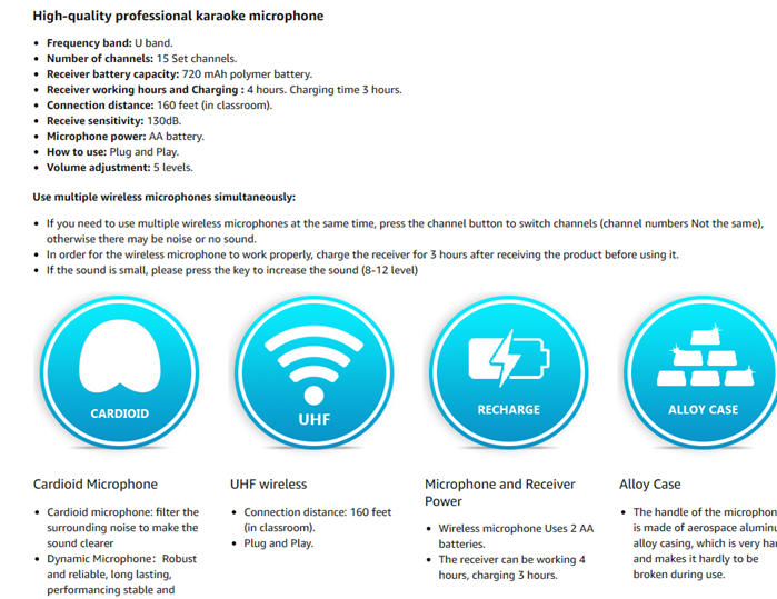 • Long Distance Wireless Karaoke Microphone: Wireless Distance Upgrade To 160 Feet (50m), Upgraded the microphone manufacturing process with Signal Stability●No Delay●No Radiation●Anti-Howling●Anti-Jamming ●Constant Frequency●Distortion <0.2%●15 Uhf Adjustable Channels. ●The Mic Outer Case Is Alloy Material Which Is Harder, Lighter And More Wear-Resistant.●We provide one year warranty.