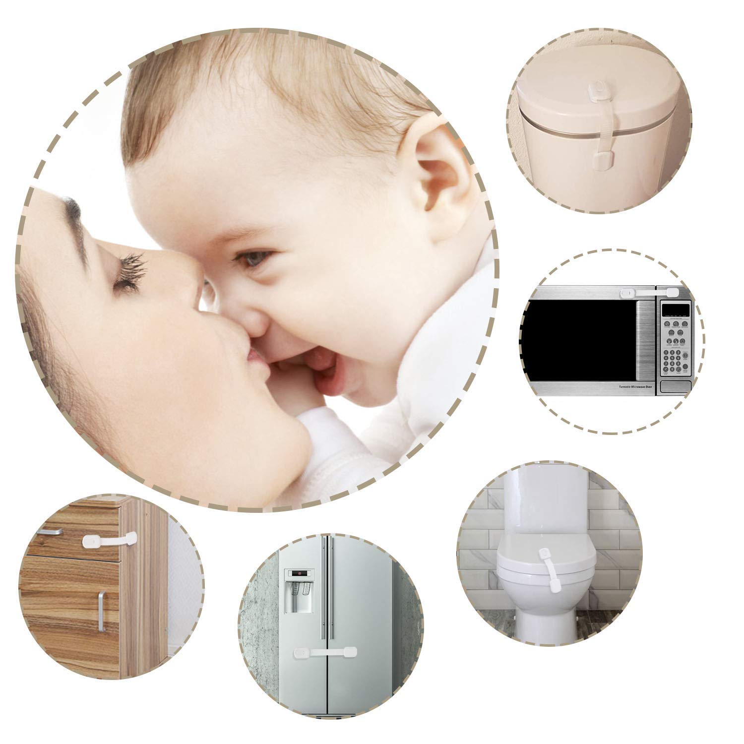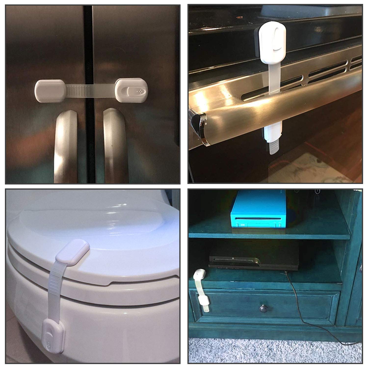 • MULTIPURPOSE USE - Child safety drawer strap locks can be used for kitchen cabinets,cupboards, drawers,door,window,refrigerator,oven,freezer,toilet seat,fridge,trash can,washing machine,electric appliances and so on