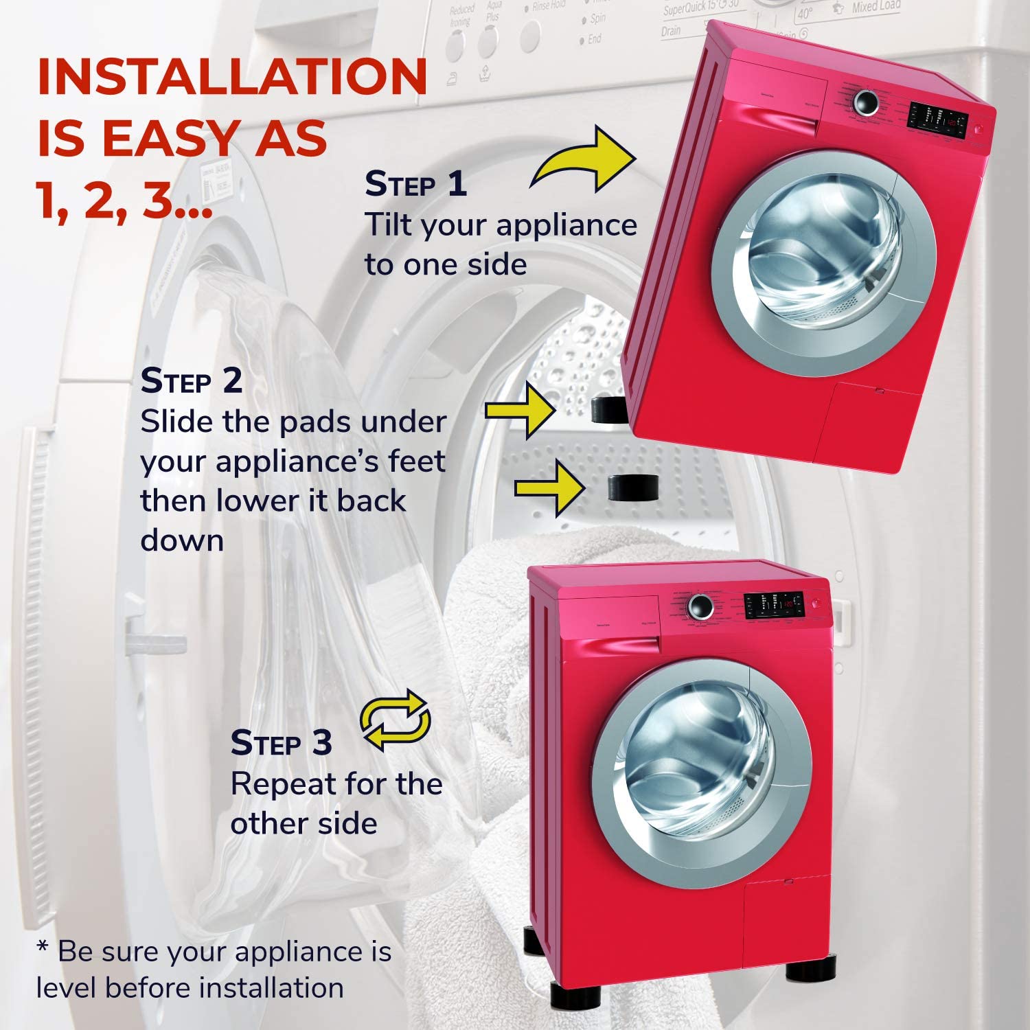 - Quick & Easy DIY Install in Minutes Without Tools - Simply tilt your appliance to one side, slide a VibraShield pad under each lifted foot, lower your appliance's feet onto the pads, then repeat for the other side. Installs quickly in a few easy steps without tools or professional installation. Before installing, ensure your appliance is level