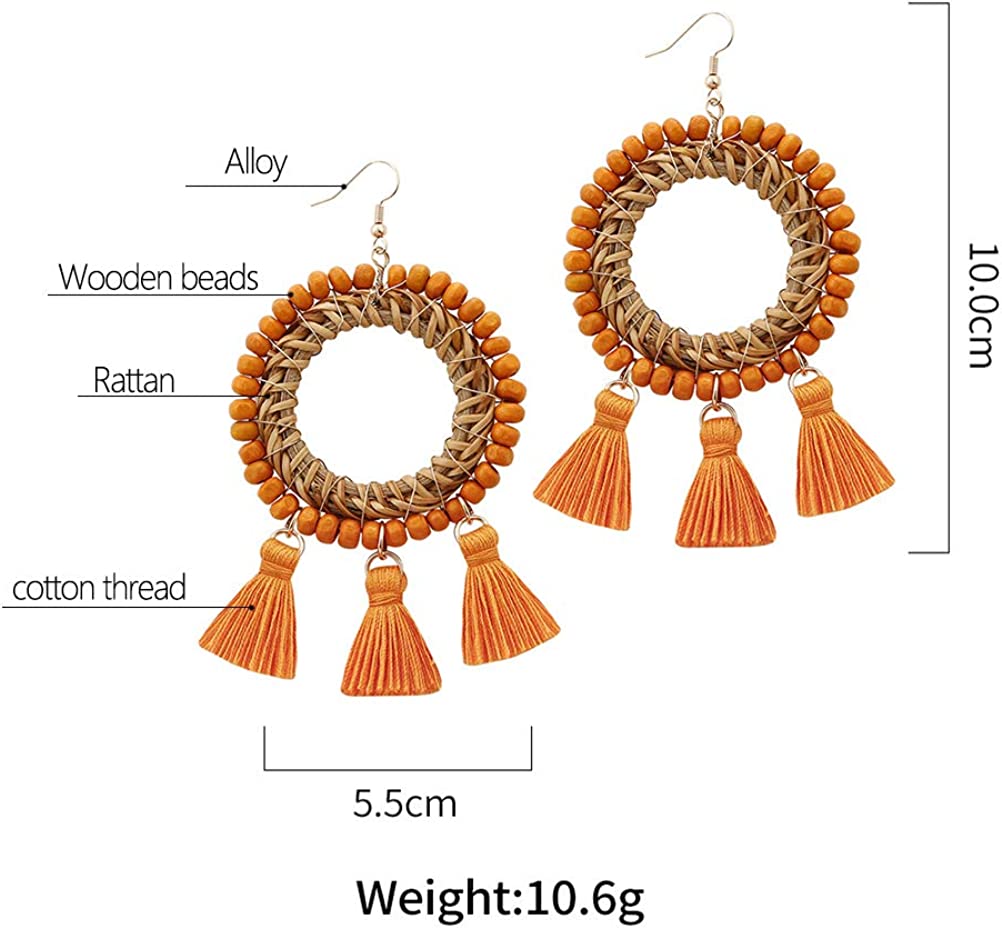 • MATERIALS: This handmade wicker woven earrings crafted with a string of wood beads and natural rattan fiber and cotton thread fringe. If you want to express a retro bohemian style, this one is the perfect choice
