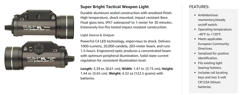 The Streamlight 69264 TLR-1 HL is a lightweight, compact, lithium battery powered gun-mounted tactical flashlight featuring the latest in shock-proof high power LED technology and providing 1.5 hours of continuous run time with 1000-lumens. Tethered battery door and latch mechanism prevents battery door loss while providing easy battery replacement. When enabled, the strobe is activated on two or more momentary paddle hits. Mounts directly to handguns with Glock-style rails and to all MIL-STD-1913 (Picatinny) Rails, however; kindly confirm fitment and compatibility prior to purchase. The Streamlight 69264 includes keys for Glock-Style, Picatinny, Beretta 90two, S&W 99 and S&W TSW handguns.