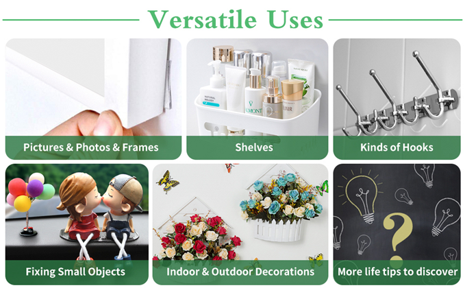 After use -- Press down hard and hold for 20 seconds after sticking, to make the adhesive tape fully contact with the surface,this will help maintain long-lasting stickiness .
