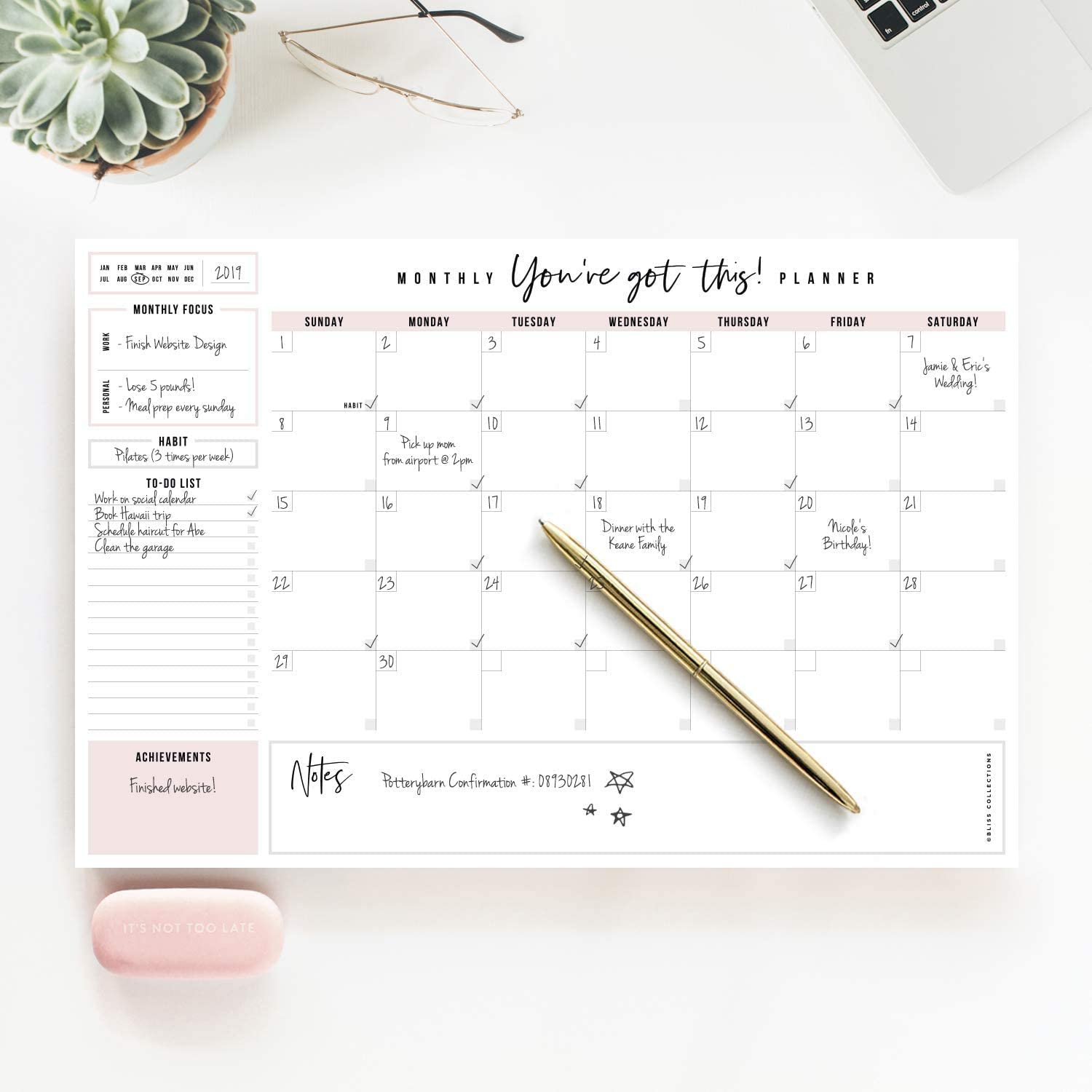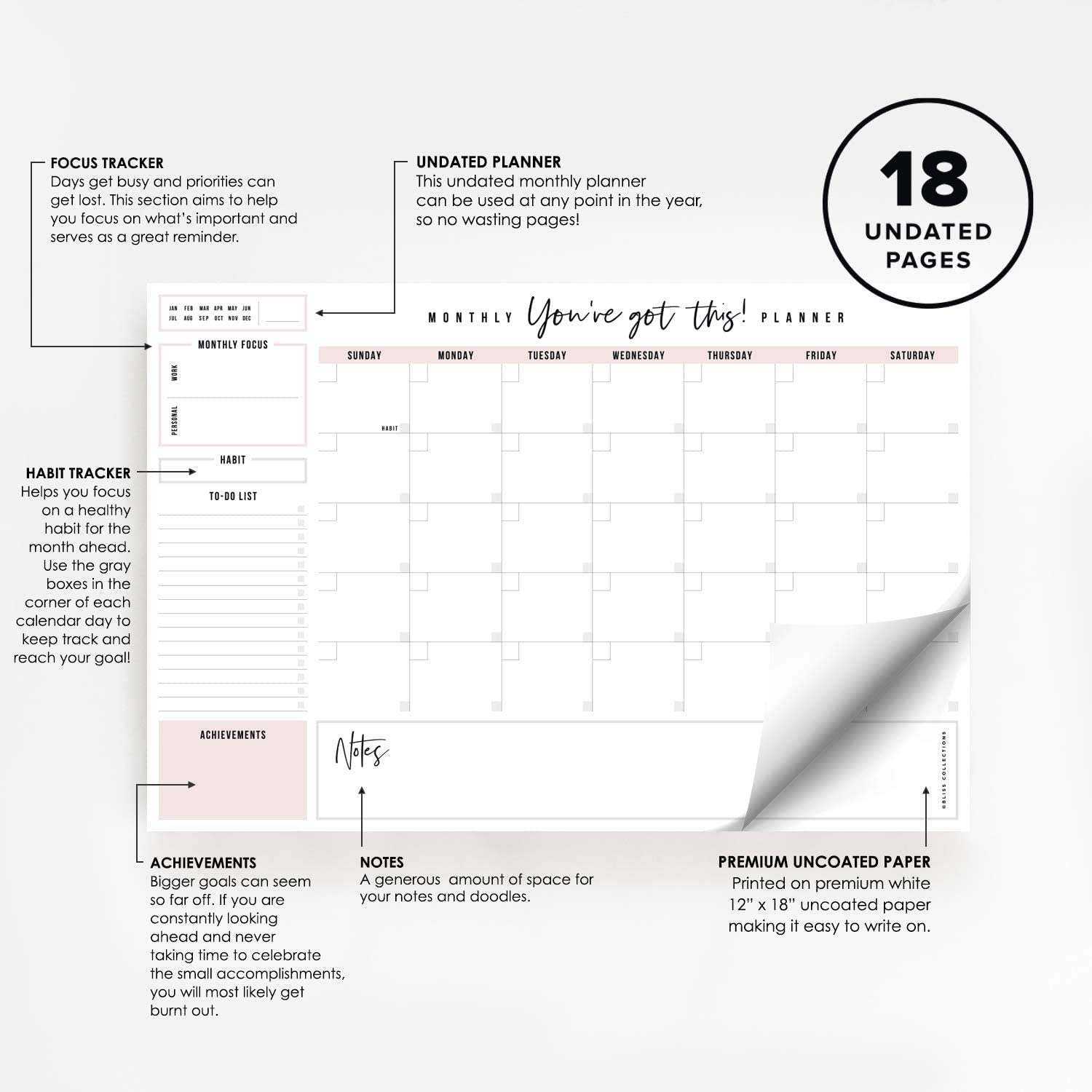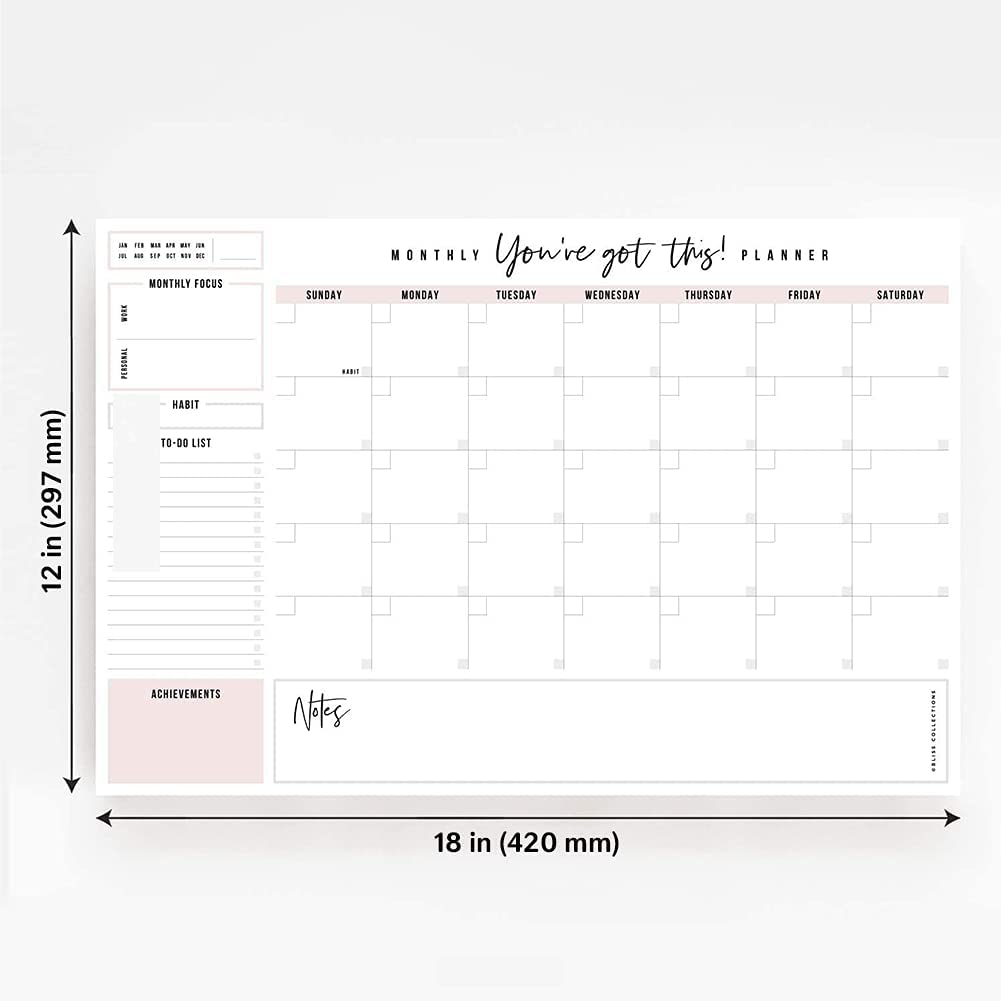 Bliss Collections Monthly Planner, "You've Got This", Undated Desk Calendar and Planner for Organizing and Scheduling Tasks, Productivity Tracker, Goals, Notes and To-Do Lists, 12"x18" (18 Sheets)