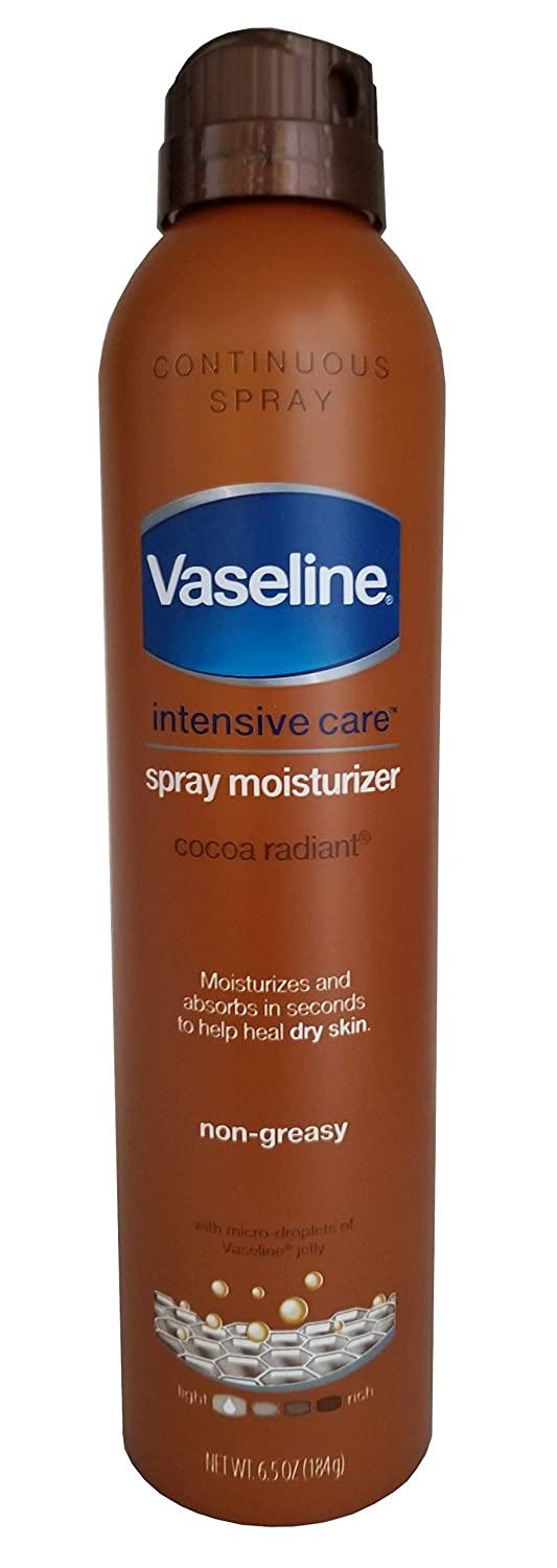 Vaseline Intensive Care Cocoa Radiant Lotion Spray is the easy way to get even and full-body coverage that helps heal dry skin by delivering deep moisture. Vaseline is clinically proven to keep skin healed for 3 weeks (after using daily for 4 weeks), this non-greasy, fast-absorbing skin lotion is the perfect daily go-to moisturizer for dry skin. Our original healing microdroplets of Vaseline Jelly allow the skin’s natural barrier to recover by locking in that moisture. And when combined with 100 percent pure cocoa butter, an ingredient known to bring out the skins natural glow, it’s the ideal moisturizer for relieving everyday dryness while enjoying dewy glowing skin. Utilize Vaseline's Spray Lotion to enjoy instantly softer skin after showering, or whenever your skin feels dry. Vaseline Cocoa Radiant Spray On Lotion is the perfect daily body lotion for maintaining smooth, soft skin. The non-greasy formula relieves dry skin quickly by penetrating deep into skin’s layers, and it helps smooth rough skin, so skin feels soft and healthy. For best results when you have limited time, spray this body moisturizer over your body after you get out of the shower. Vaseline spray lotions are dermatologist-tested and approved and have been designed for easy application and even all-over coverage.