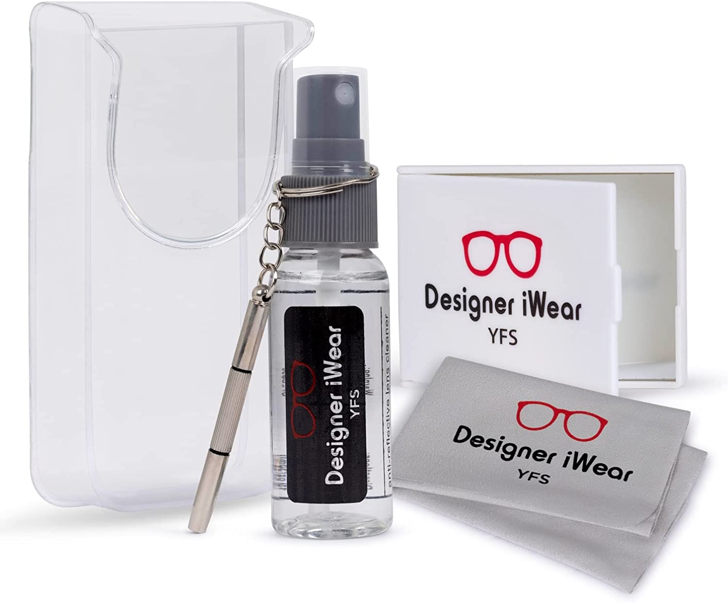 ?GREAT VALUE- FREE CLEANING KIT. Includes: a Designer iWear 1 ounce spray bottle, mirror, screw driver/key chain, and a folded microfiber cloth.
