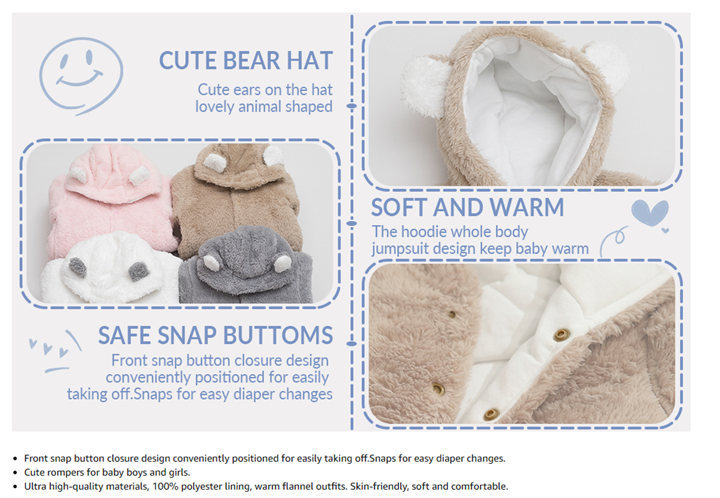 • Fun Cartoon Bear Hoodie: Lovely bear ears design for your baby, it can keep them warm outside but look cute. This is essential in your baby's wardrobe in cold winter.