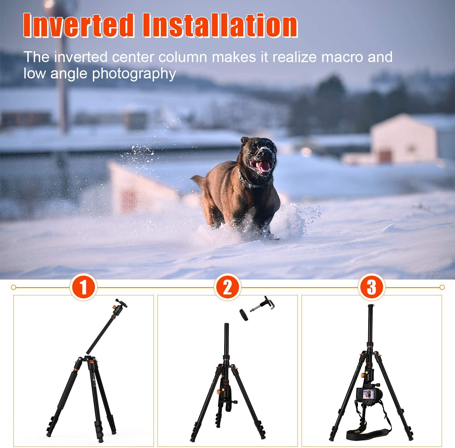 Versatility: This tripod can be quickly disassembled with the central axis screw and transformed into a monopod (34.5” to 82”) to provide an alternative way of shooting.