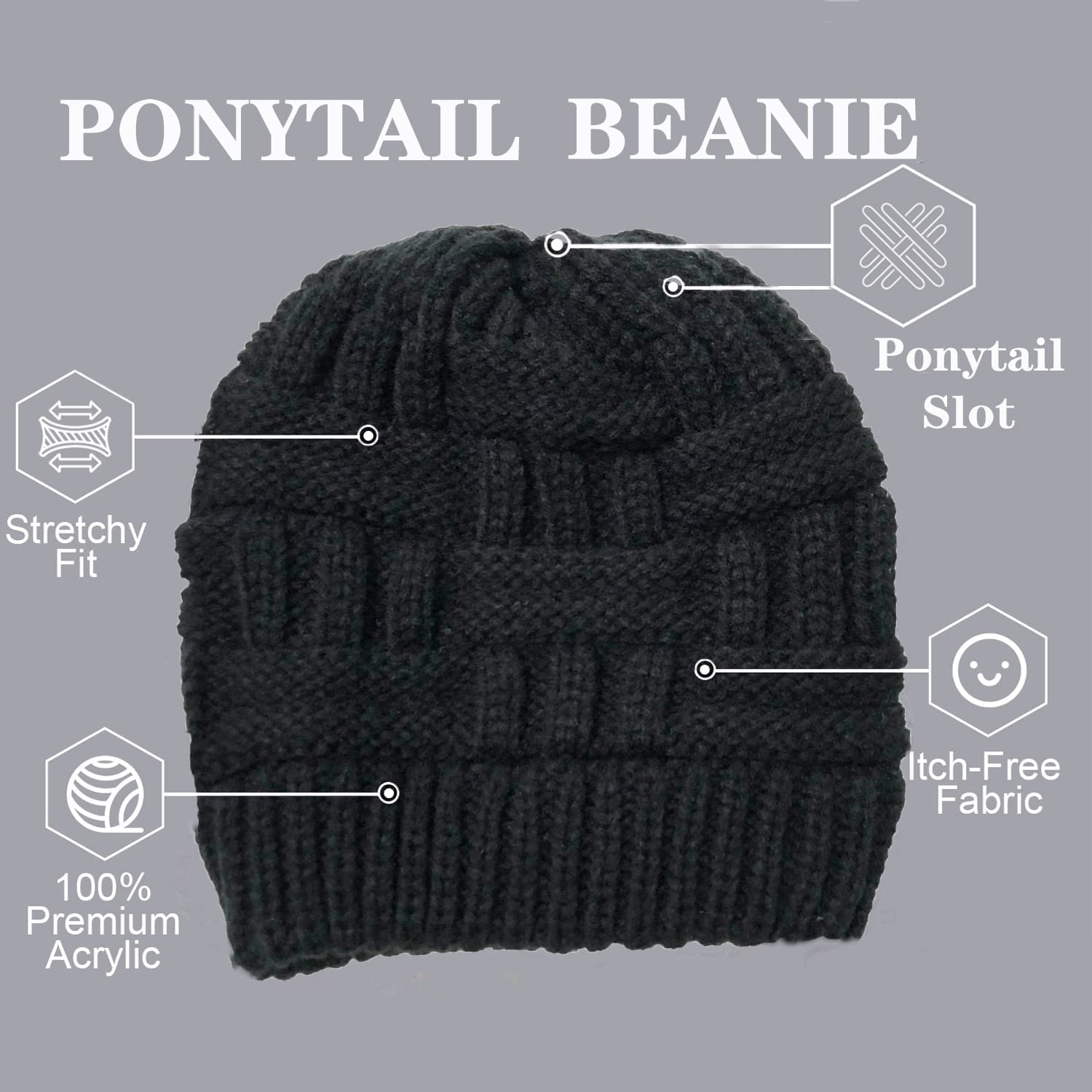 Fits all hair styles: These ponytail beanies were designed with ponytail hole on the top of the hat, which is perfect for pulling your messy bun or high ponytail. With a durable and stretchy elastic band to adjust to any size or style of hair. No matter your hair is thick, thin, curly, wavy, straight dreadlocks braids, coarse or fine, wear hat tighter around the head for a high pony tail or bun can keep you looking super fashionable.