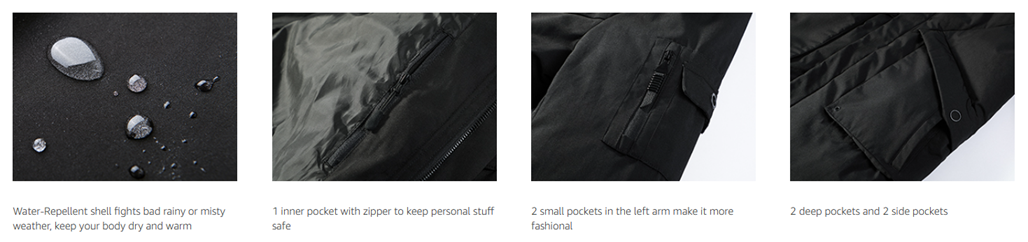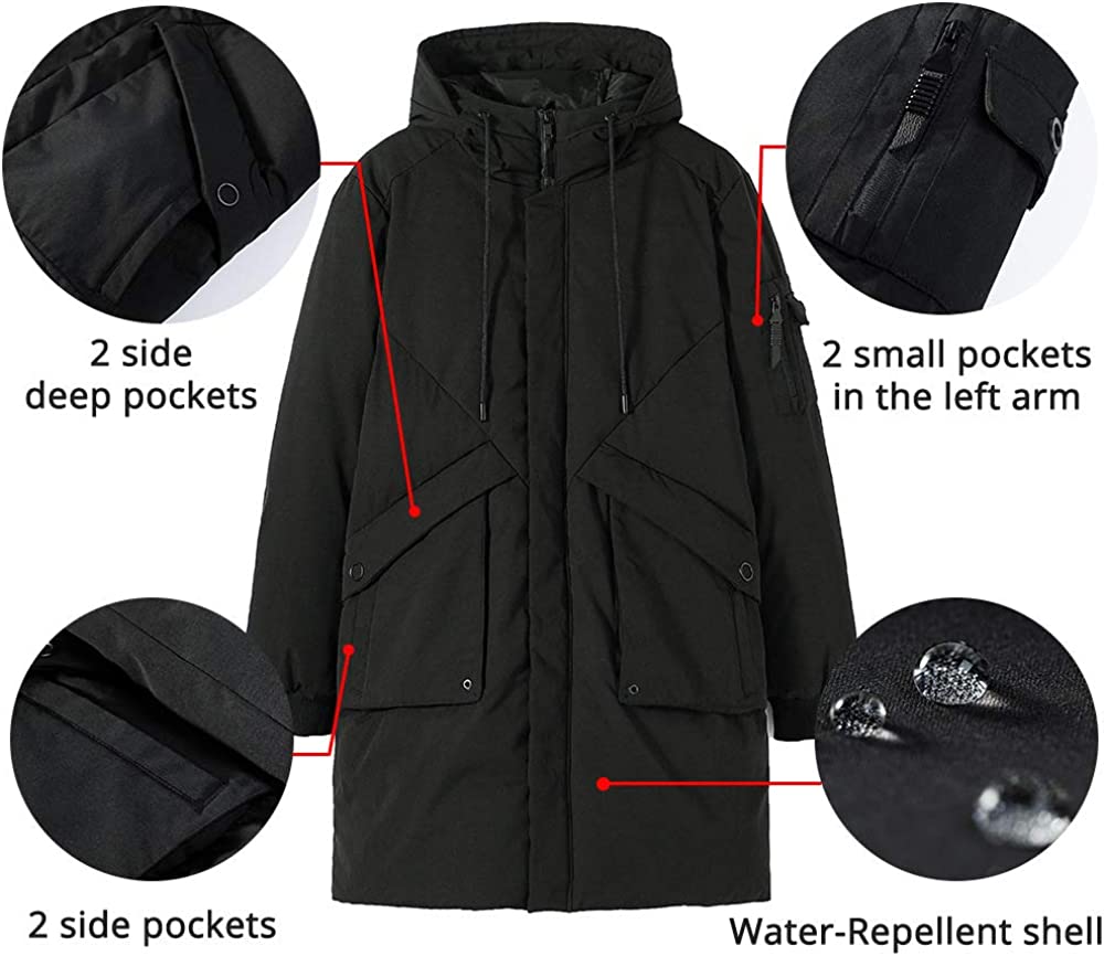 • DESIGN 1: Water-Repellent shell fights bad rainy or misty weather, keep your body dry and warm; down cotton quilted filling provides perfect warmth and comfort in cold fall and winter; total 7 pockets, 2 deep pockets and 1 inner pocket with zipper to keep personal stuff safe, 2 side pockets to keep hands warm, 2 small pockets in the left arm make it more fashional; hooded design with Drawstring prevents cold air