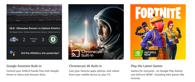 • Voice Control. The built-in Google Assistant is at your command. See photos, live camera feeds, weather, sports scores, and more on the big screen. Dim the lights and immerse yourself in your favorite show or music using only your voice. And control your SHIELD hands-free with Google Home or Alexa and Amazon Echo. Format/Container support: Xvid/ DivX/ASF/AVI/MKV/MOV/M2TS/MPEG-TS/MP4/WEB-M