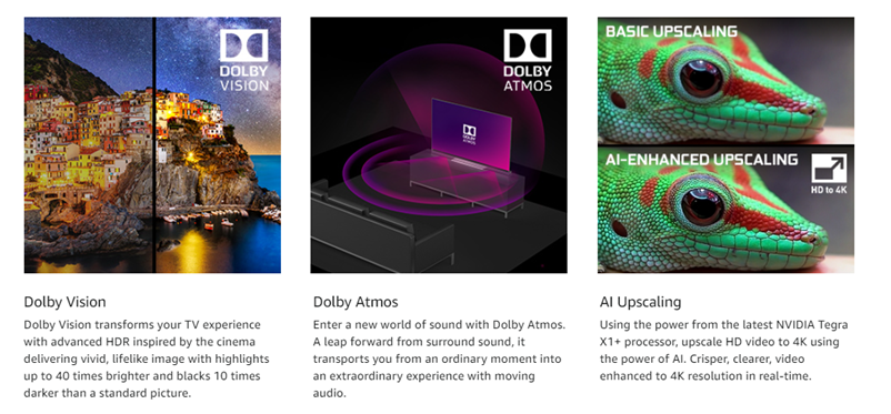 • Dolby Vision - Atmos. Bring your home theater to life with Dolby Vision HDR, and surround sound with Dolby Atmos and Dolby Digital Plus—delivering ultra-vivid picture quality and immersive audio