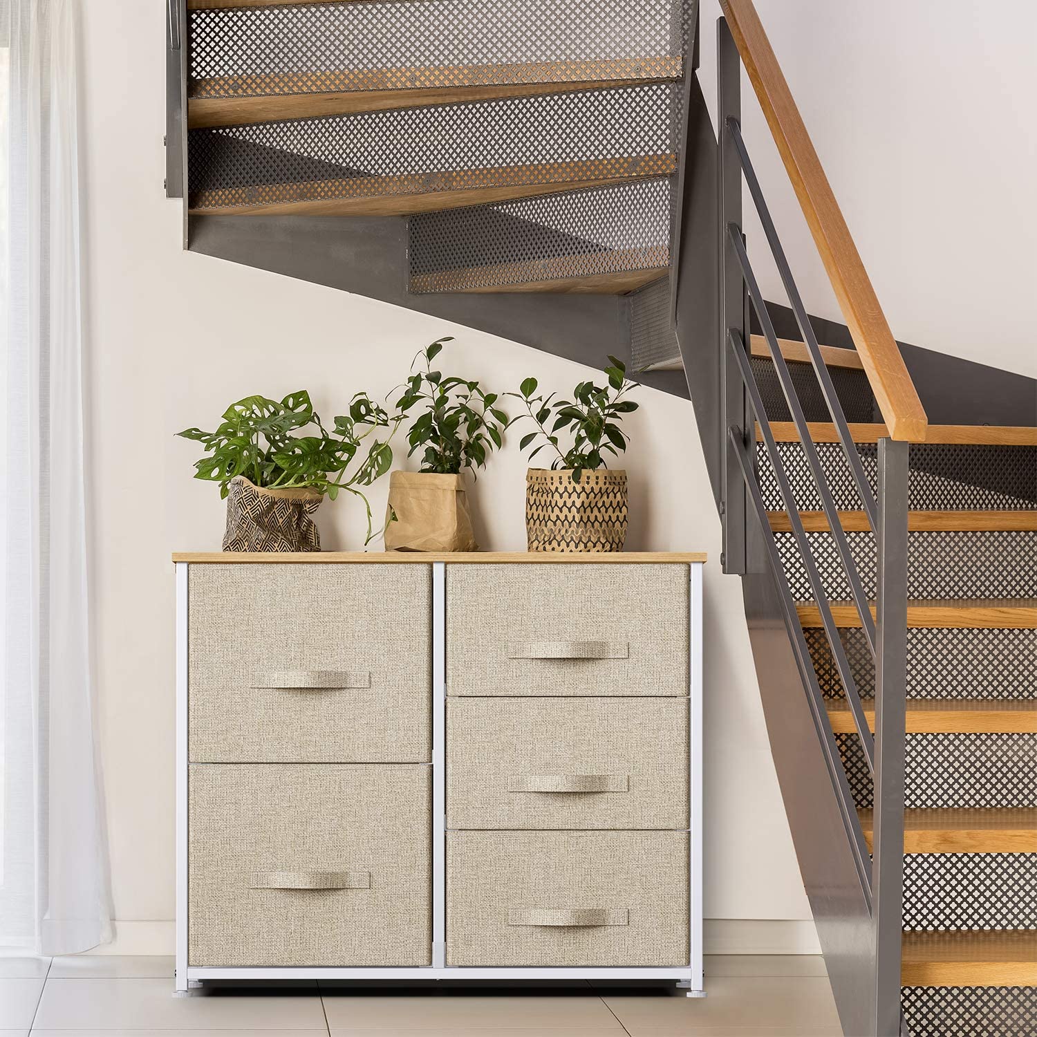 • Wood top and fabric drawers