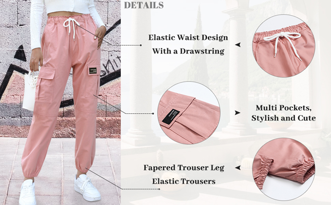 • Features:Solid color & pattern,high waist,elastic ankle cuffs and tapered leg.Multi pockets are convenient and practical for you to carry the small things.