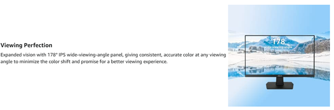 The 23. 8” Full HD VA24EHE monitor is elegantly designed to complement any desk. Va24ehe’s gorgeous 178° wide viewing angle display is great for sharing. It includes input connectivity for HDMI, VGA, DVI-D and the adjustable tilt design allows for freedom in movement up to -5°+23°.
