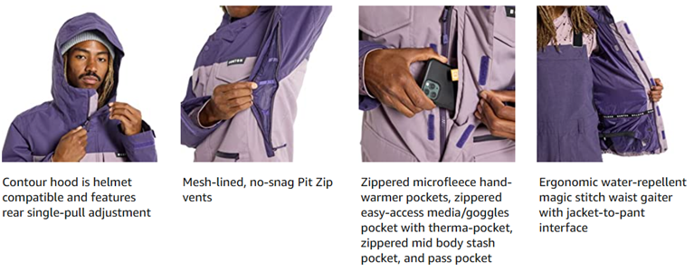 • Removable waist gaiter with jacket-to-pant interface; Cargo and chest pockets, media/goggles pocket with inside therma-pocket, and pass pocket for storage