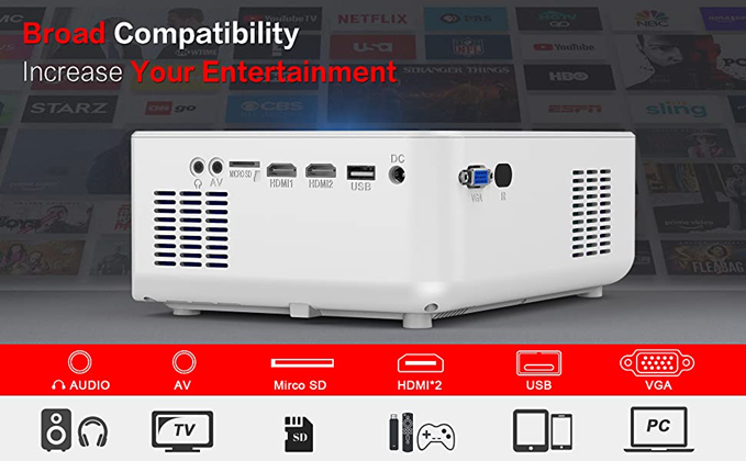 FANGOR F506 WiFi Bluetooth projector is equipped with 3*HDMI port, 2*USB ports, 1*AV port, 1*VGA port, 1* 3.5mm Audio port,1* Micro SD port