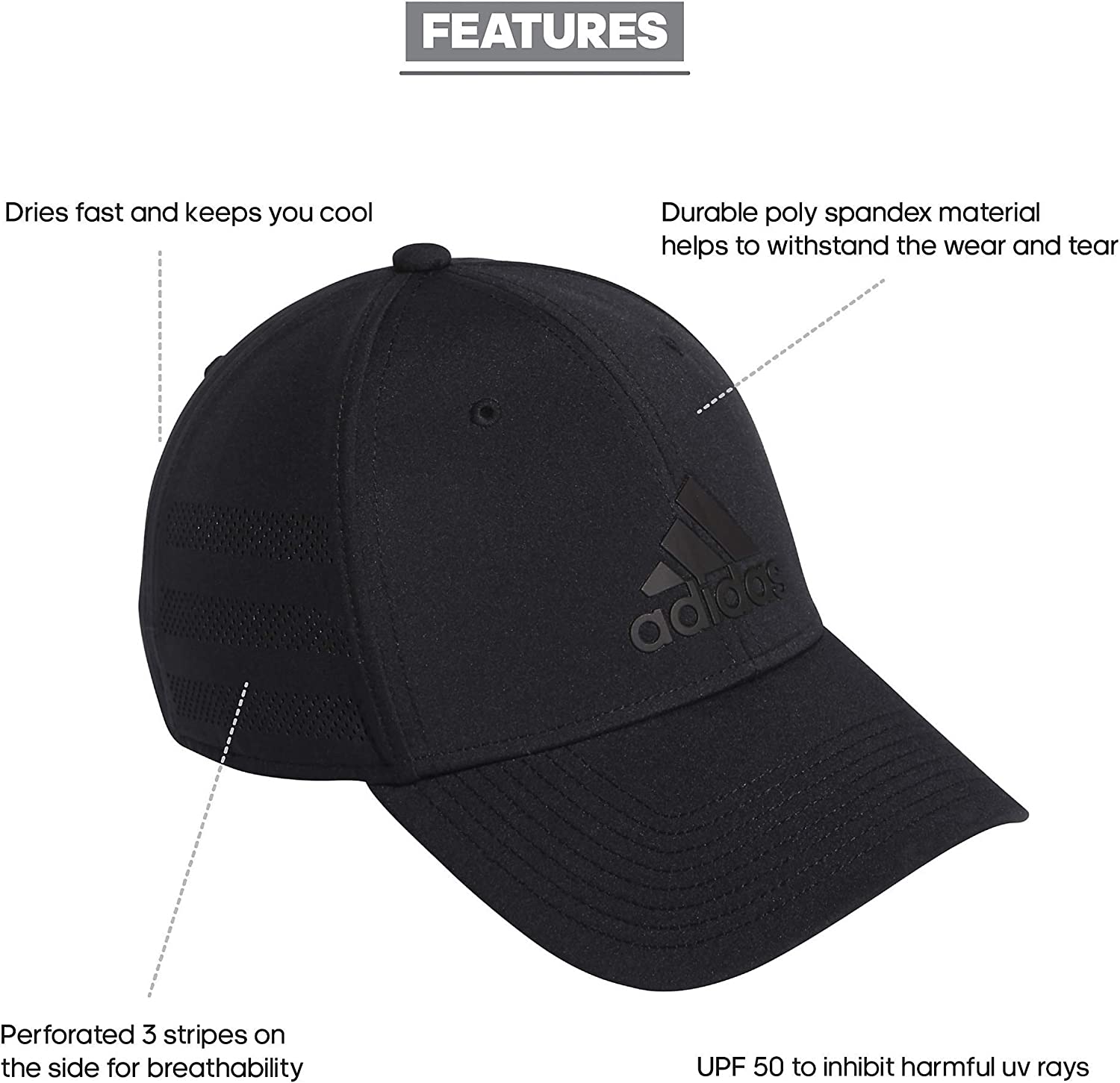 This sporty cap keeps you covered and comfortable on the sidelines or during practice. it's made of smooth fabric that stretches to fit. the cap dries quickly and has perforated 3-stripes on the sides for ventilation.