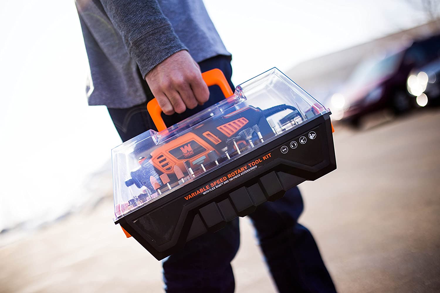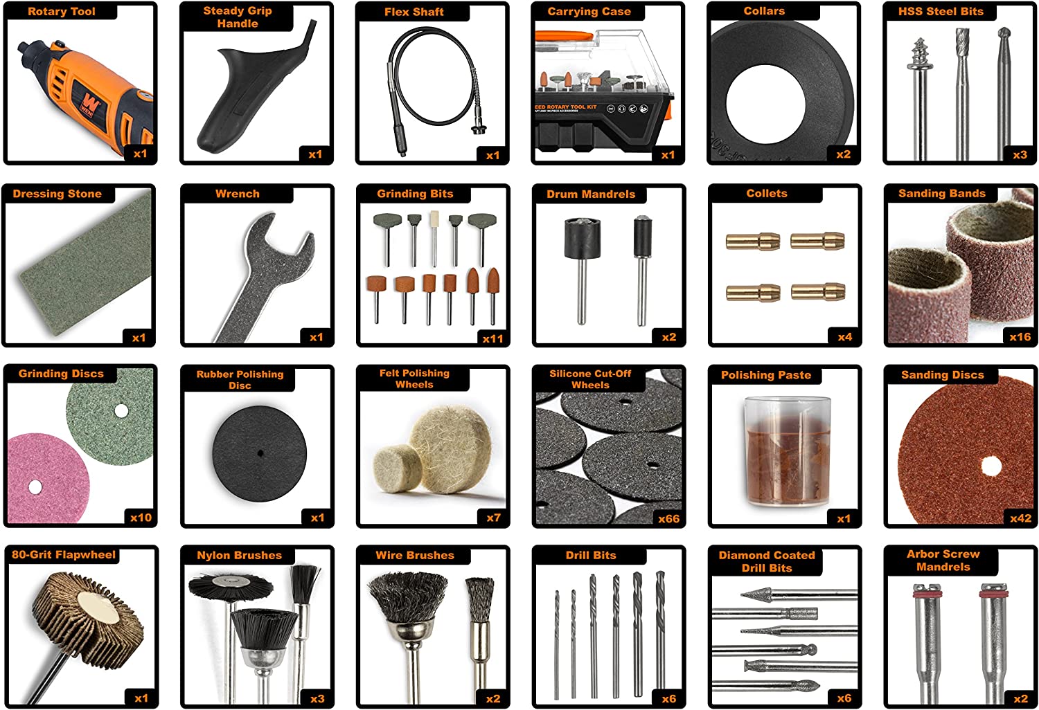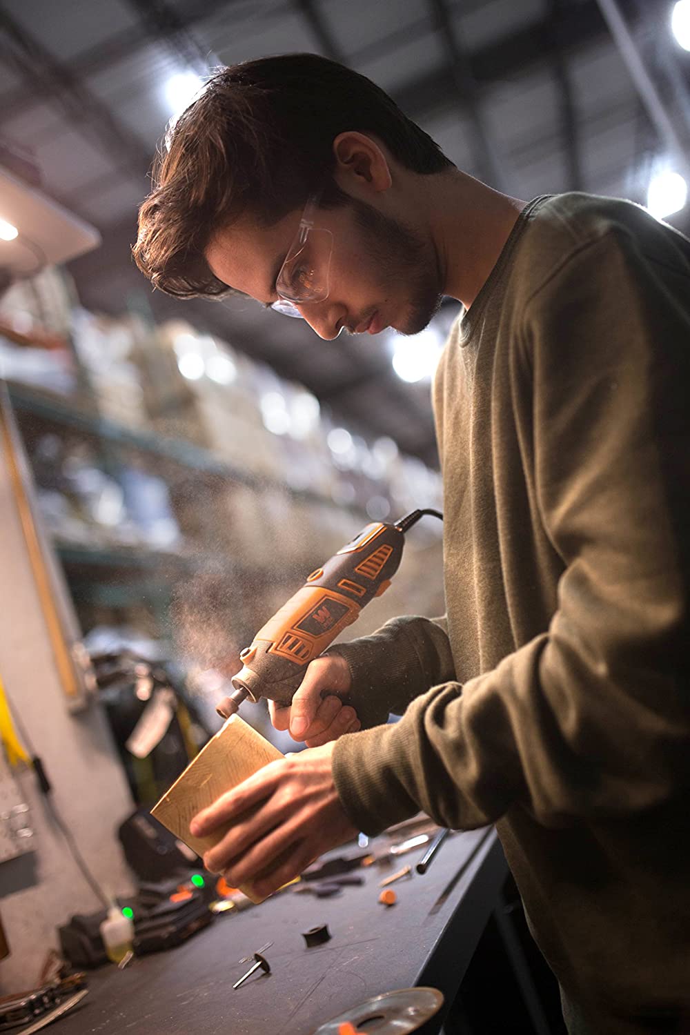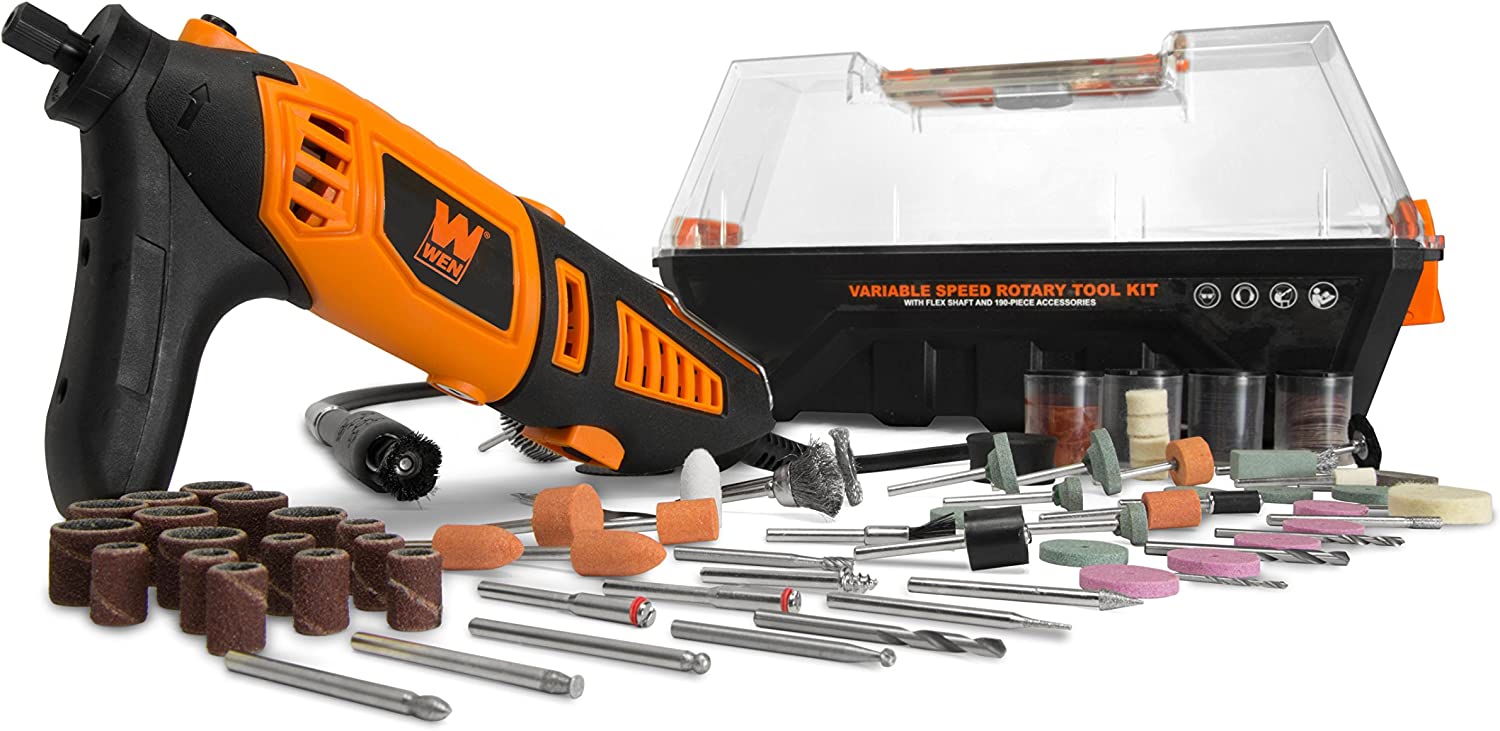 Remember when you had versatility and power all in the palm of your hand? Remove rust from rusty stuff. Trim your dog’s toenails. Engrave beautiful images into your neighbor’s windows while they’re vacationing in Rome. With the WEN Rotary Tool the possibilities are endless, limited only by your imagination and federal law. Equipped with over 190 accessories, this package provides a wide variety of bits and discs to meet the needs of any project. Variable speed can be set anywhere from 8,000 to 35,000 RPM with the simple turn of the speed dial. The handy carrying case makes transportation and storage easier than ever while the lightweight 1.3-pound body limits fatigue during operation. Versatile collet selection allows for bits anywhere from 1/32 of an inch to 1/8 of an inch in size. The removable steady-grip handle provides an alternative method for holding the rotary tool. Its ergonomic design evenly distributes the weight of the tool along the back of your hand, maximizing comfort during long work sessions. Swap the steady-grip handle out for the included flex shaft to help take on intricate and complex designs in glass, plastic, wood, steel and more. And because it is a WEN product. a stocked inventory of replacement parts, and a friendly and helpful phone line. Carve, cut, grind, deburr, engrave, shape, drill, polish and other verbs all with the WEN Rotary Tool Kit. Remember when you had one tool that could do it all? Remember WEN.