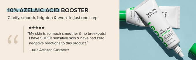 • Paula's Choice 10% Azelaic Acid Booster also contains salicylic acid (BHA) a gentle exfoliator. The multi-tasking formula boasts a lightweight, oil-free texture that works beautifully on its own or mixed with other acne treatments, like benzoyl peroxide.