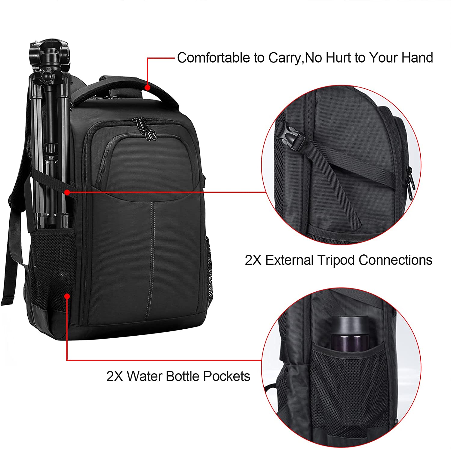 ?Rain Cover Included & Tripod Holder: Comes with a water resistant RAIN COVER for entirely weatherproof. Lightweight tripod can be attached to 2 sides of the photography backpack(Attention: length of tripod should not exceed 17''after folding,width should not exceed 5.9''), this camera case has 2 elastic side pockets for water bottle or umbrella.