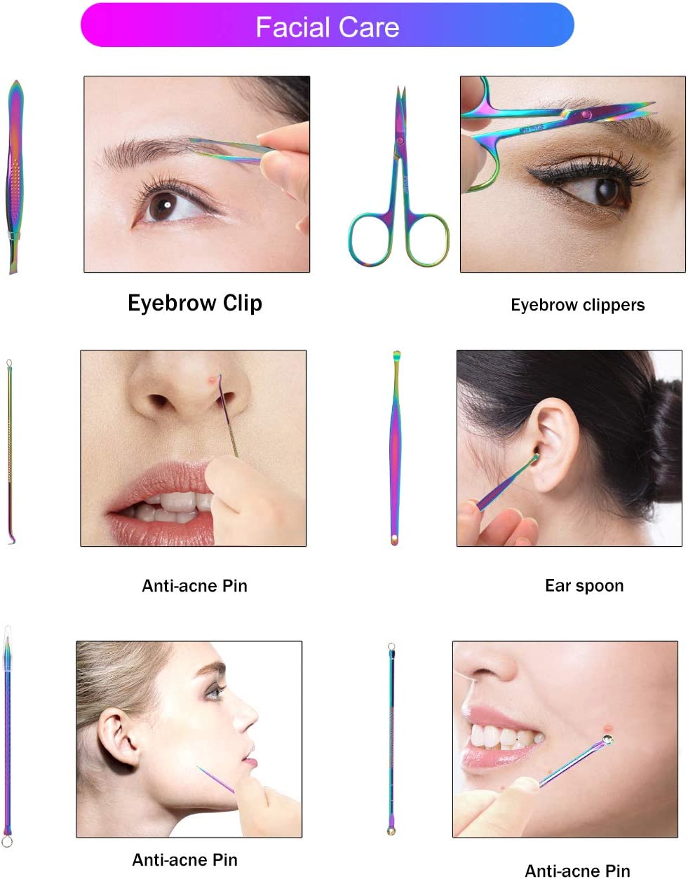 • 【 EXQUISITE TECHNOLOGY】:Made of top high stainless steel and are produced with highest standards to ensure every tools are pretty and sturdy not only using comfortable, but also easy to trim. You don’t have to buy another fingernail clippers, toenail clippers, nail cutter, nail file, nose hair scissors, facial hair scissors,tweezers,ear pick,blackhead remover, pedicure kit.With this nail kit, money can be saved, and convenience can be provided.