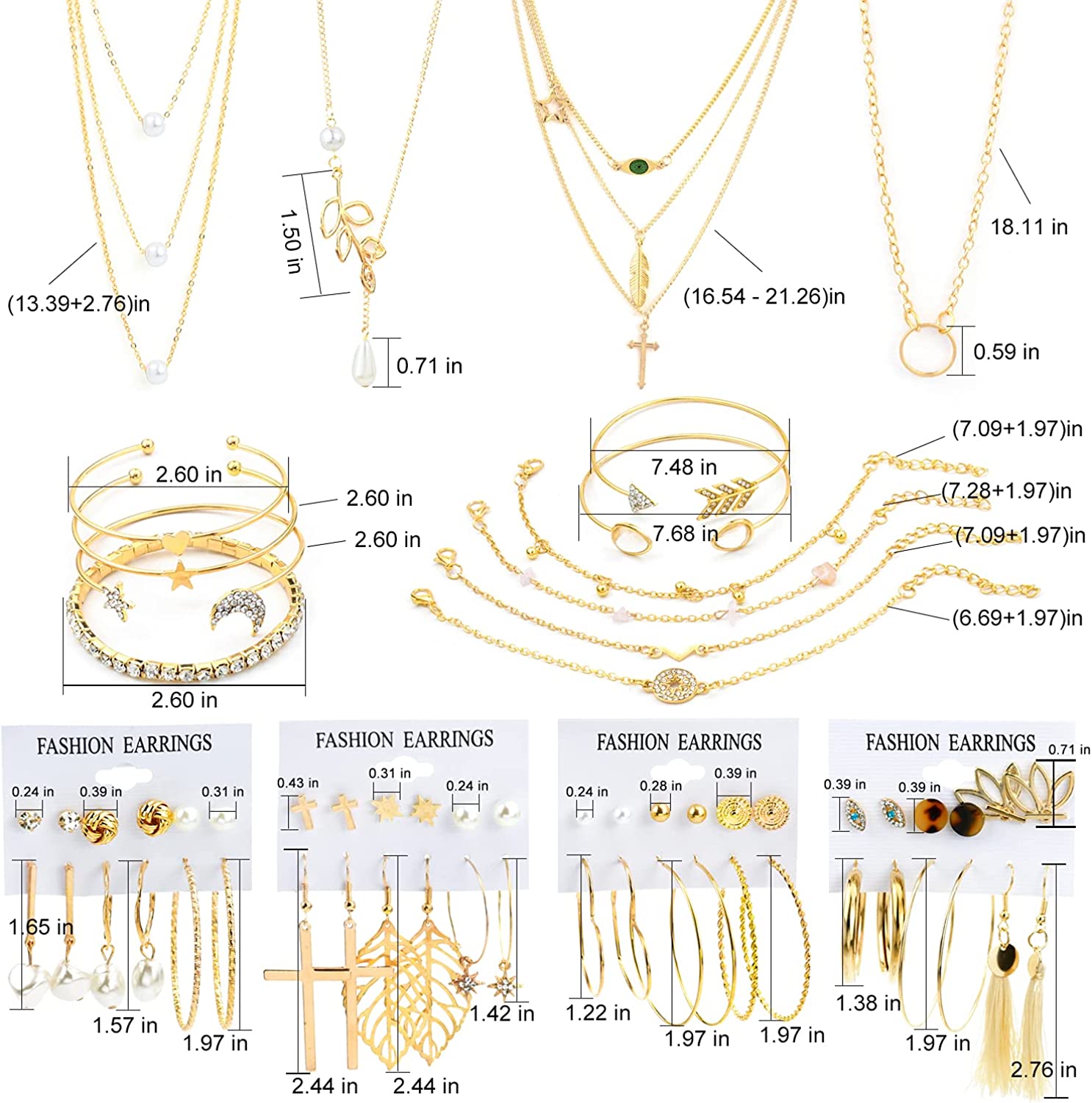 • 【VARIOUS STYLES】:The set has 4 gold necklaces,10 gold bracelets,24 gold layered ball dangle hoop stud earrings. Light weight, good quality, no harm to your body.
