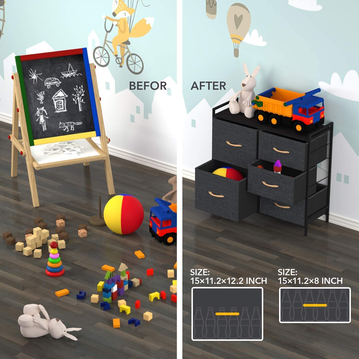 • Multifunction Cabinet: 5 Collapsible drawers include 2 sizes to satisfy your different storage needs, shelving things as you wish on top board.