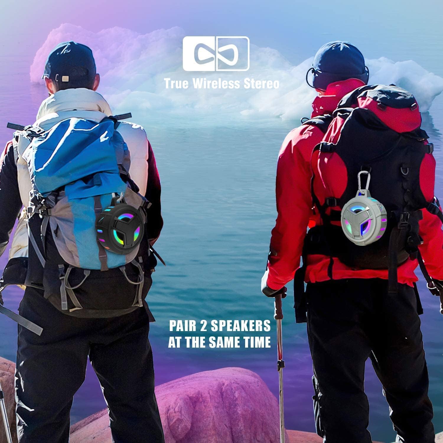 • ♬【TRUE WIRELESS STEREO & ULTRA- PORTABLE】True wireless stereo technology support two speakers play music synchronously through a Bluetooth connection, form a wireless left and right channel system to deliver you true stereo sound. Portable bluetooth speaker with rugged rubber housing, built-in hook with a carabiner so you can hang the portable speaker on backpack, bicycles, carts and anywhere you like, so it’s perfect for travel, riding, hiking, camping, and more outdoor/ indoors activities.